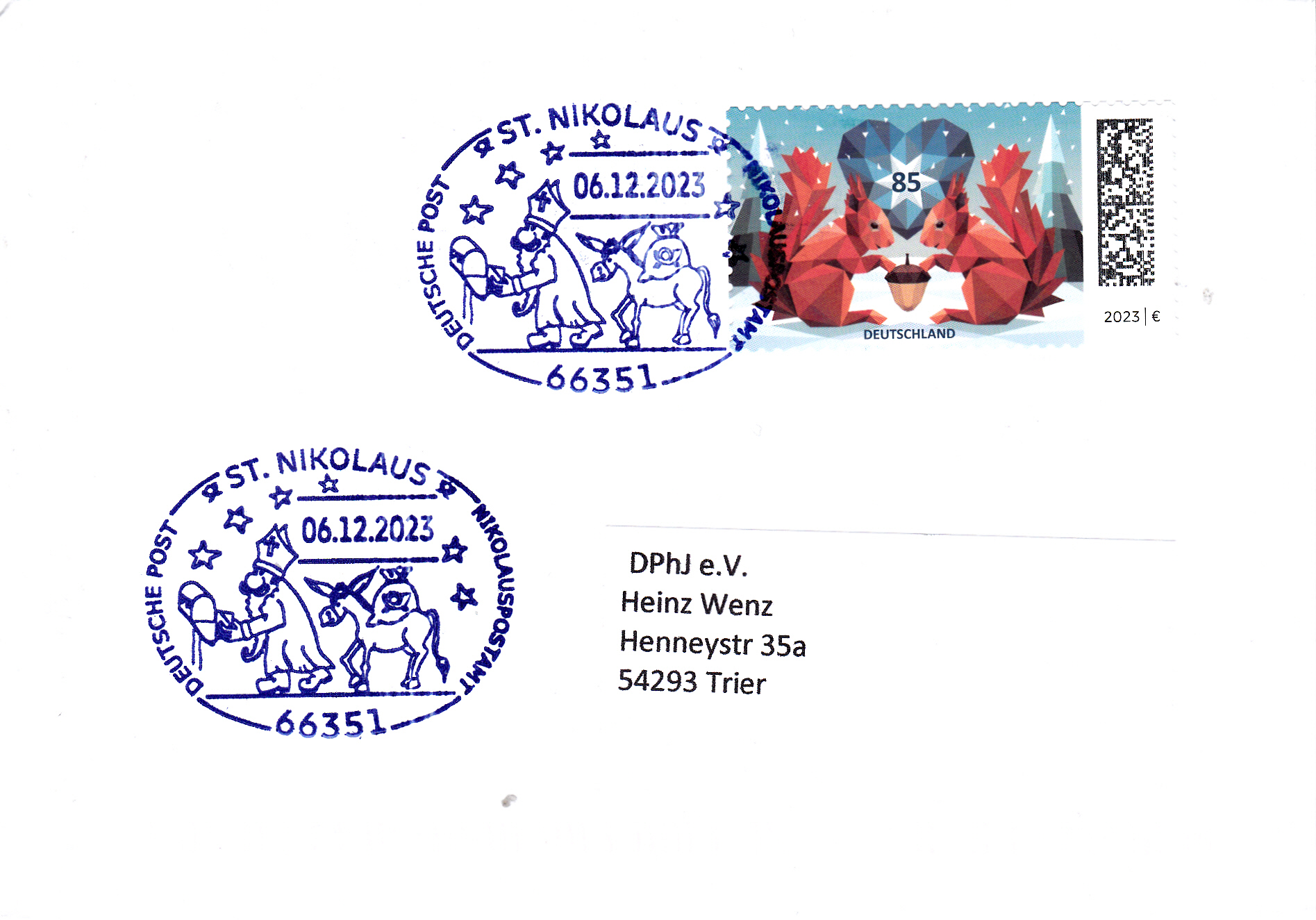 Brief mit der Weihnachts-Markeindividuell der DPhJ und einem dazu passenden Sonderstempel vom 6.12.2023 aus Nikolausdorf.