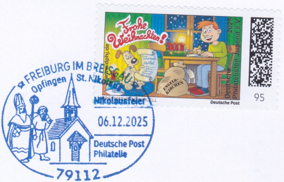 Der Sonderstempel aus Freiburg am Nikolaustag zur Nikolausfeier in Opfingen vom 6.12.2025 mit St. Nikolaus mit Stab, Knecht Ruprecht und einer Kapelle im Stempelbild.