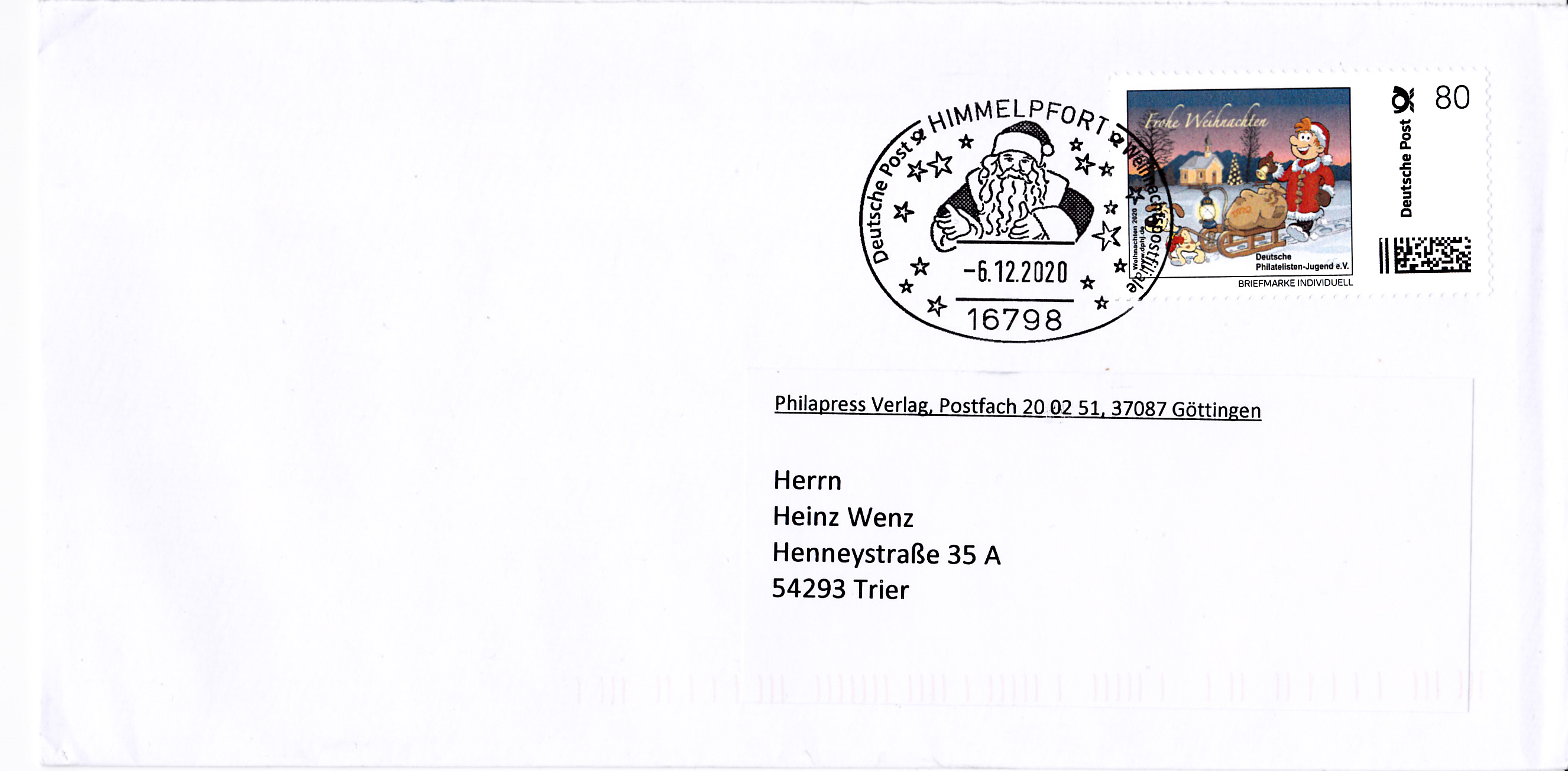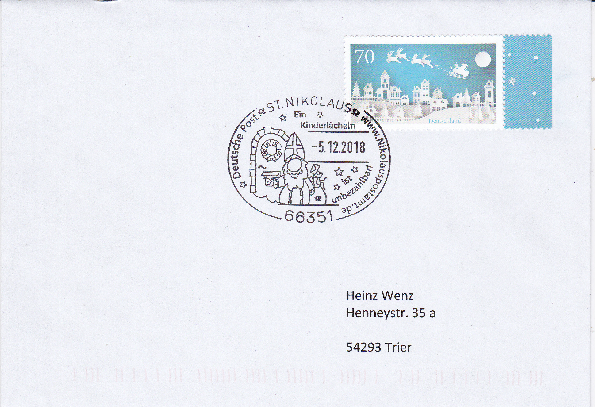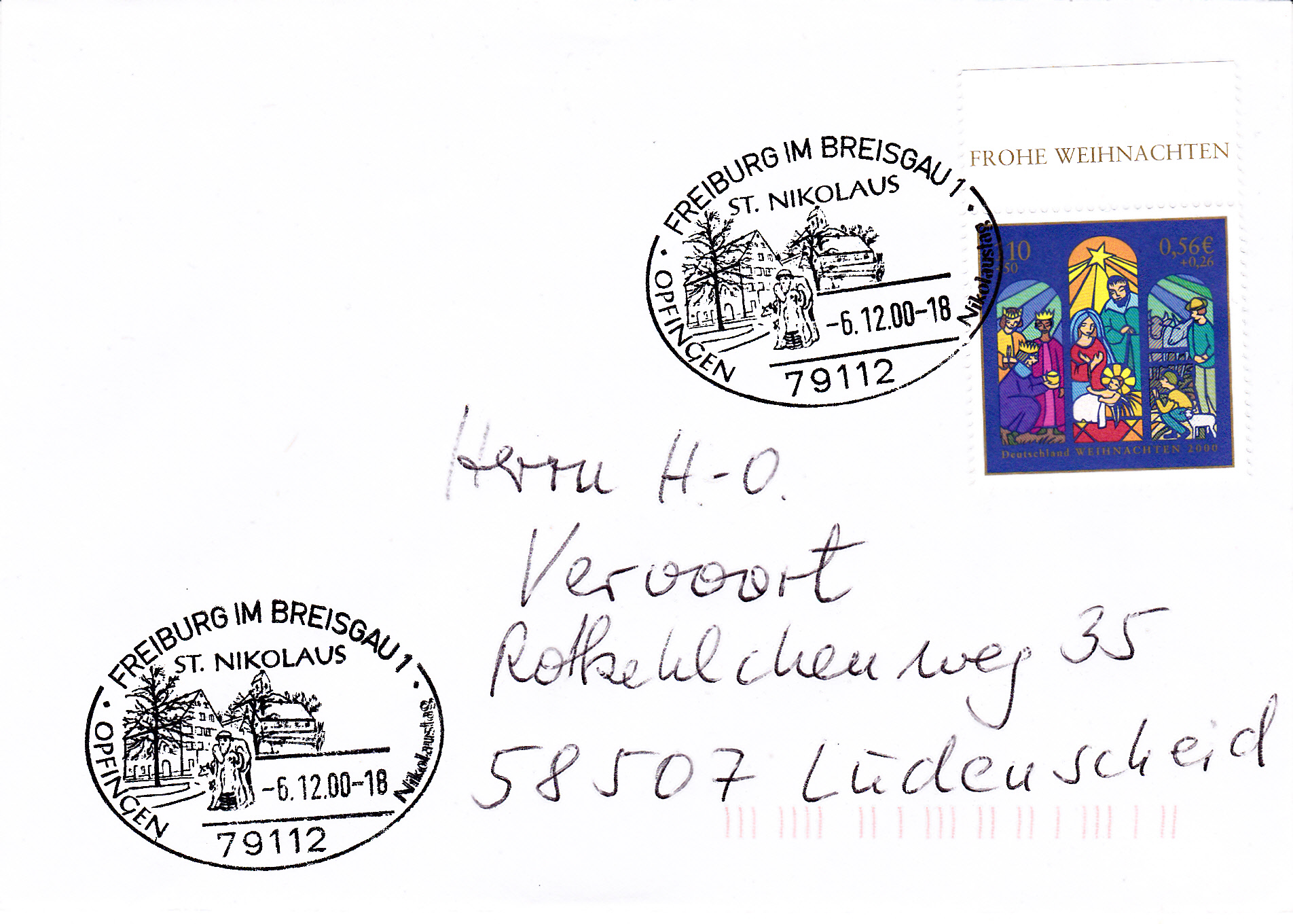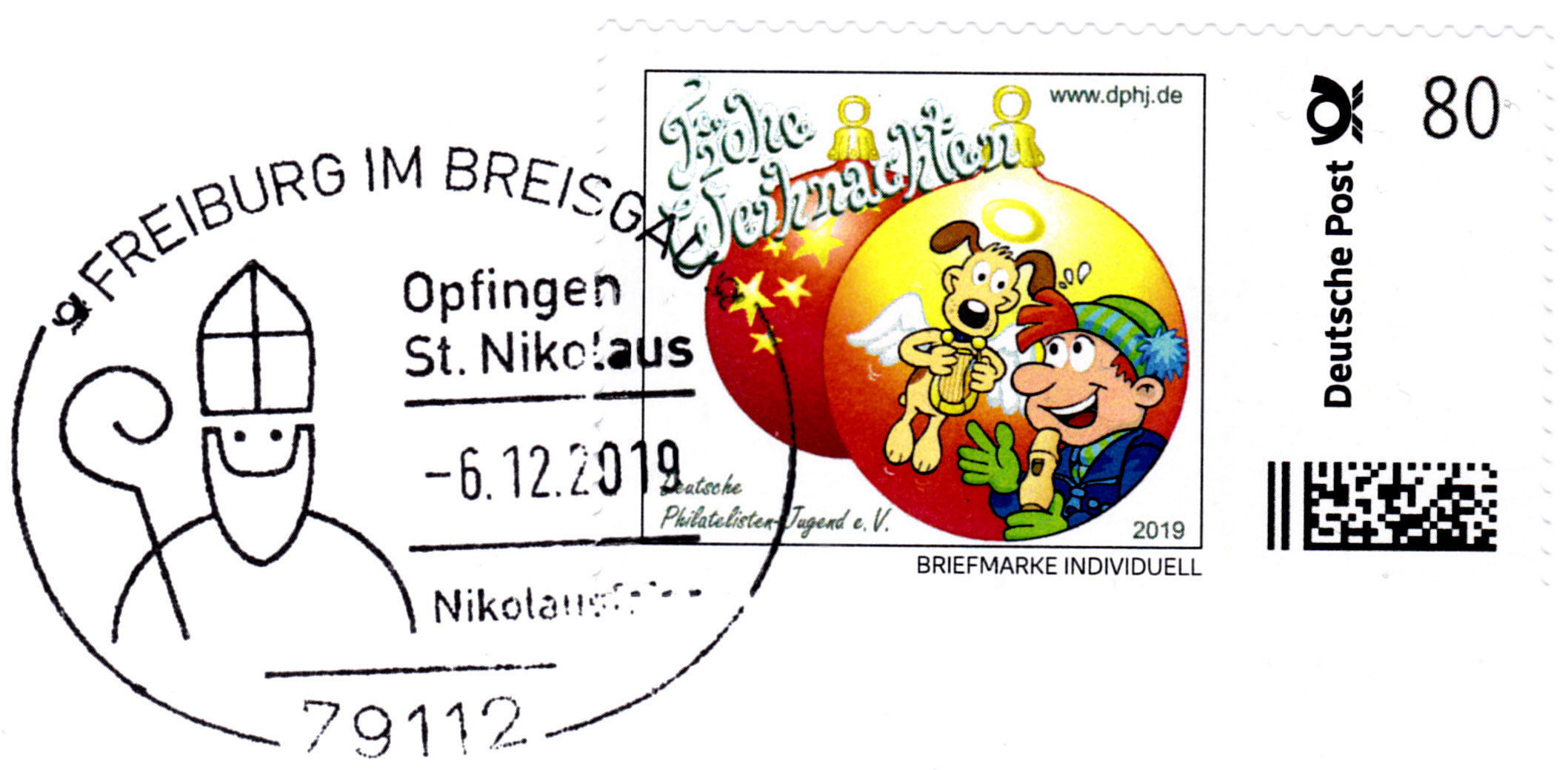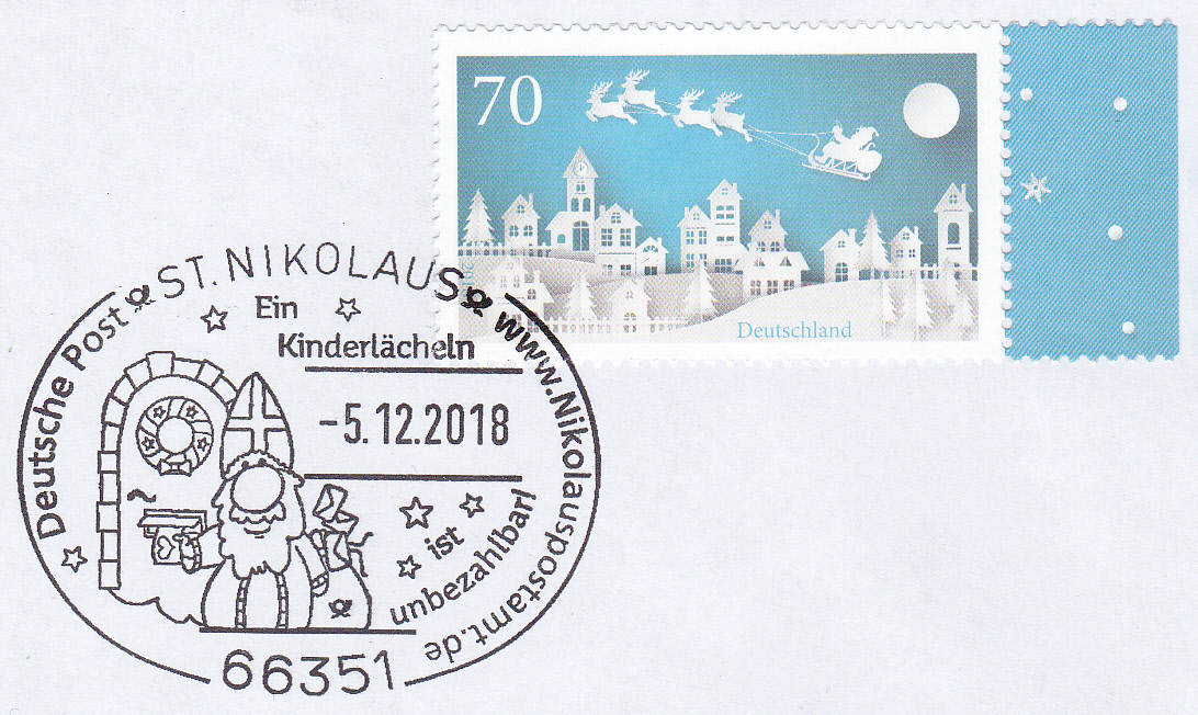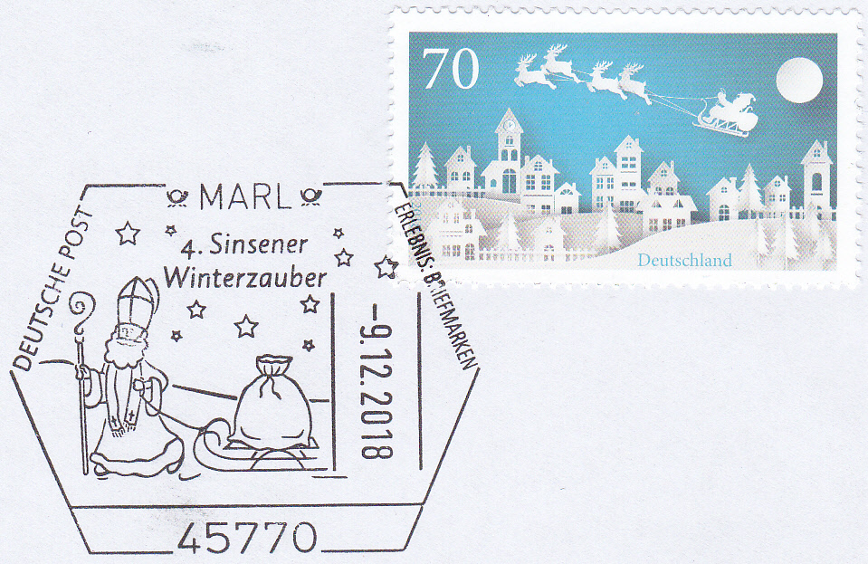 Der Sonderstempel aus Freiburg am Nikolaustag zur Nikolausfeier in Opfingen mit dem Stempelbild "stilisierter Nikolaus" wird offensichtlich alljährlich "wiederverwendet", wie dieser Stempelabschlag vom 6.12.2019 belegt. Ein neues Stempelmotiv wäre sicherlich mal wieder interessanter.