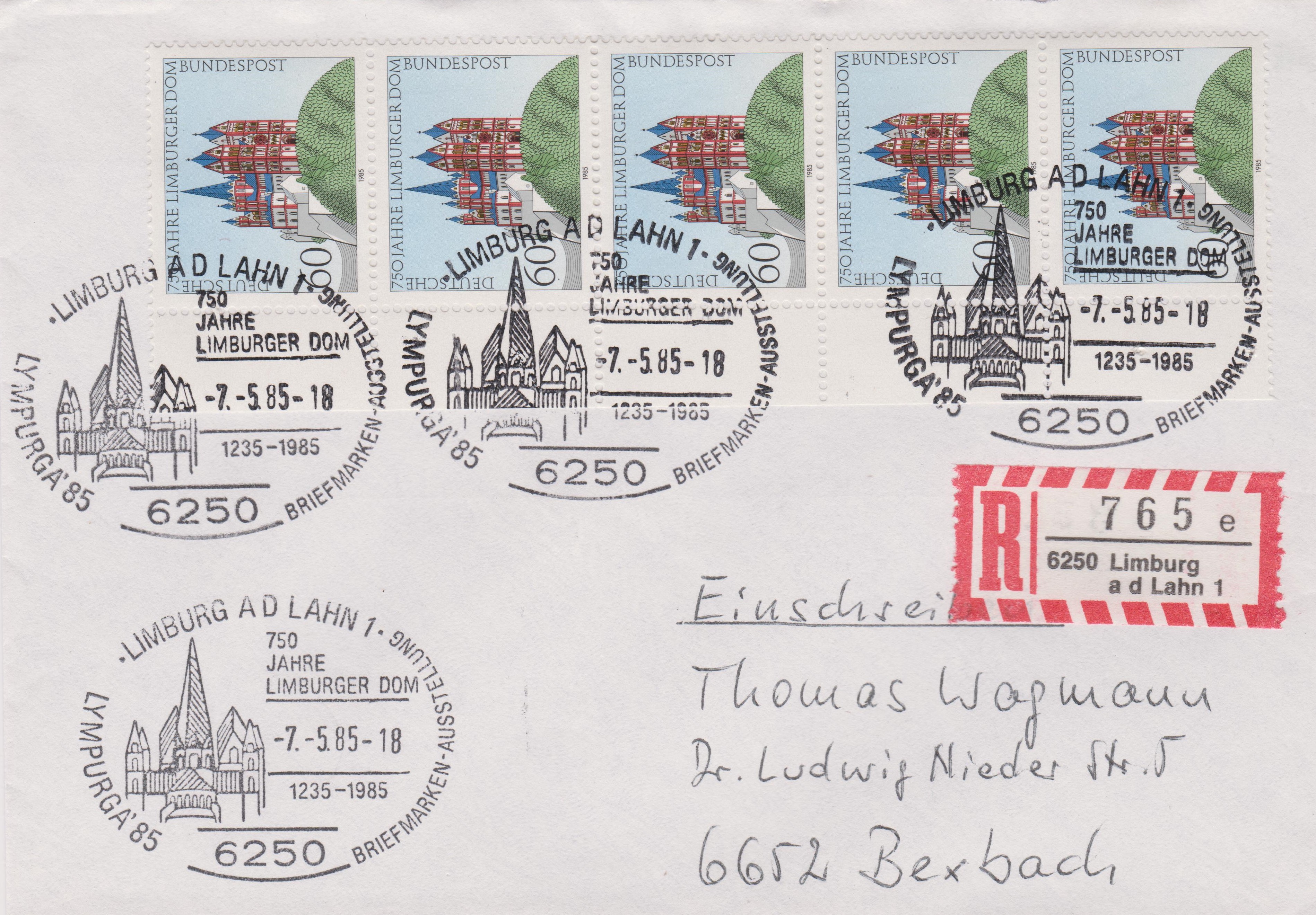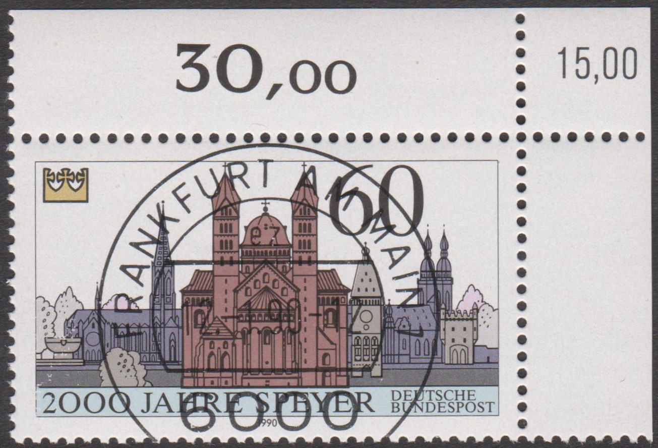 Bund MiNr. 1444 erschien am 12.01.1990 zum Thema "2000 Jahre Speyer" und zeigt als Motiv den Dom zu Speyer, hier eine rechte obere Bogenecke:
