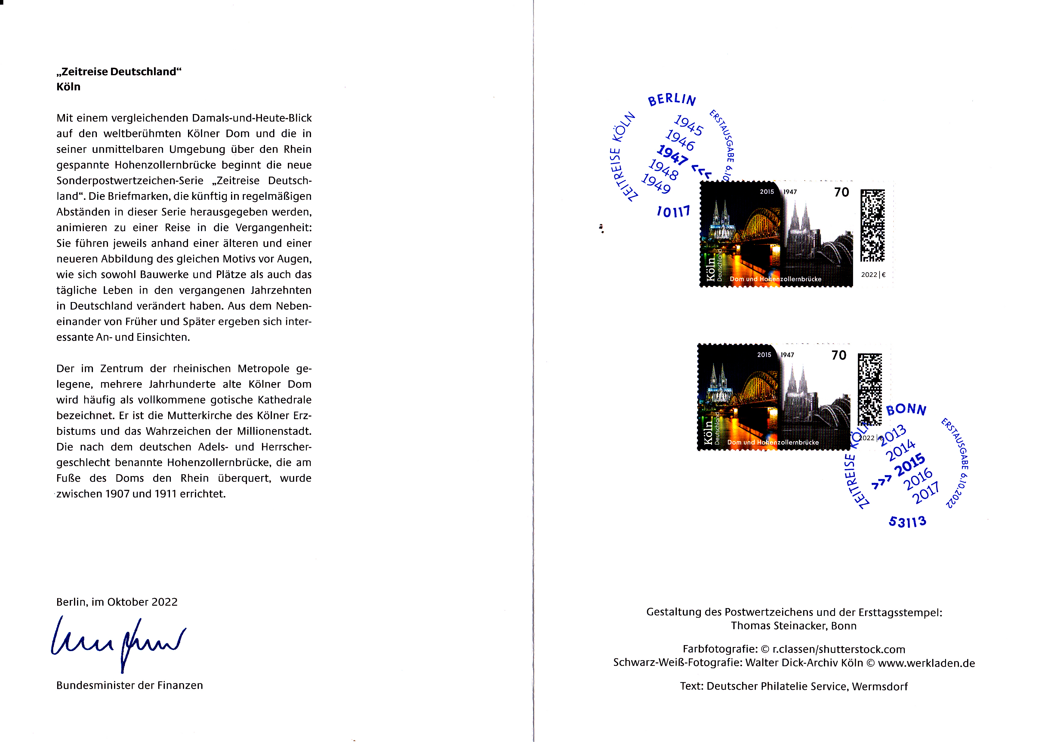 Ministerkarte des Bundesministers für Finanzen mit zwei Marken (MiNr 3721) aus der Serie "Zeitreise durch Deutschland" mit dem Motiv "Dom und Hohenzollernbrücke in Köln auf Photographien der Jahre 2015 und 1947" und den beiden Ersttagsonderstempel Bonn und Berlin.