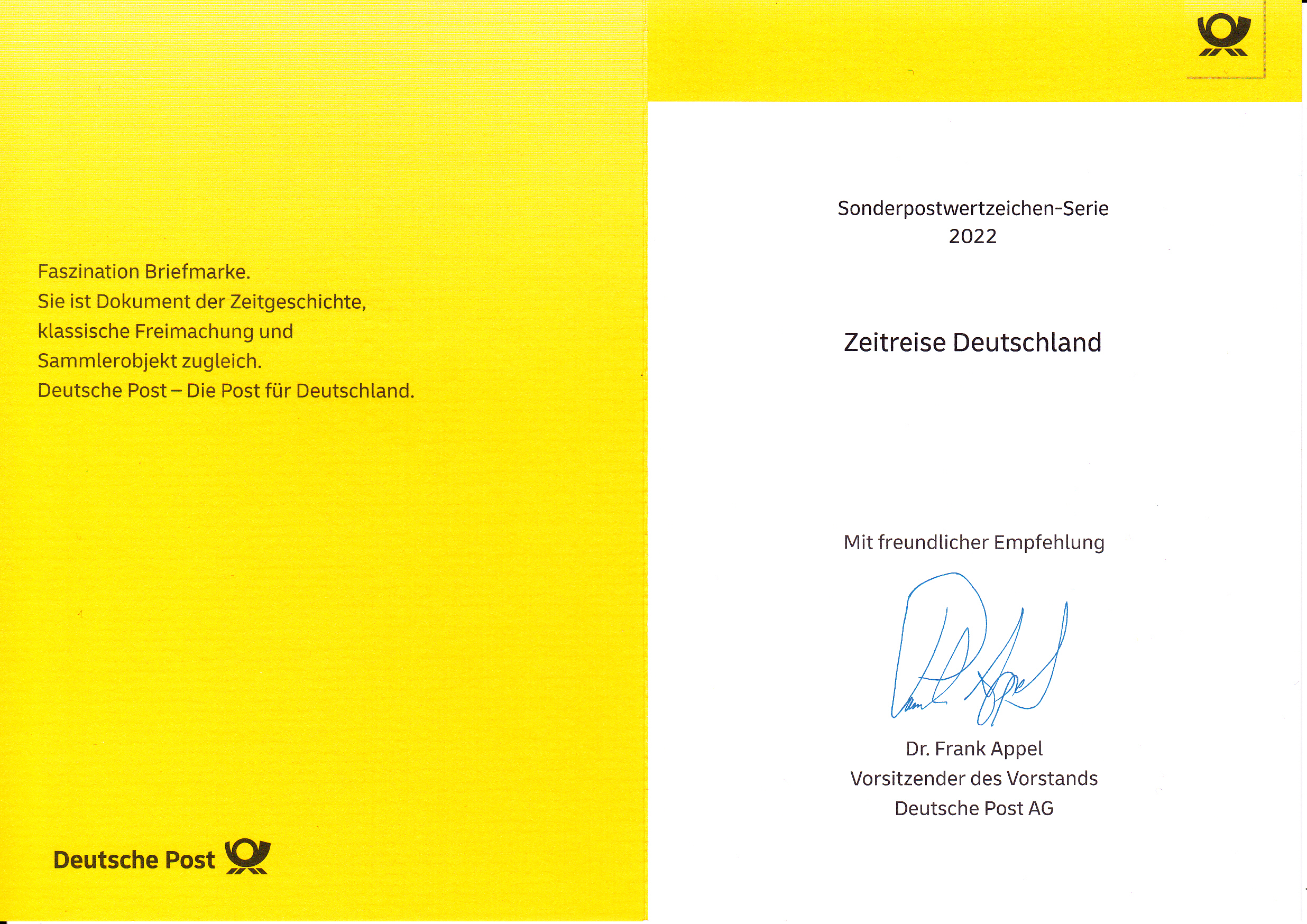 Klappkarte des Vorstandsvorsitzenden der Deutschen Post AG mit einer Marke (MiNr 3721) aus der Serie "Zeitreise durch Deutschland" mit dem Motiv "Dom und Hohenzollernbrücke in Köln auf Photographien der Jahre 2015 und 1947" und dem Ersttagsonderstempel Bonn.