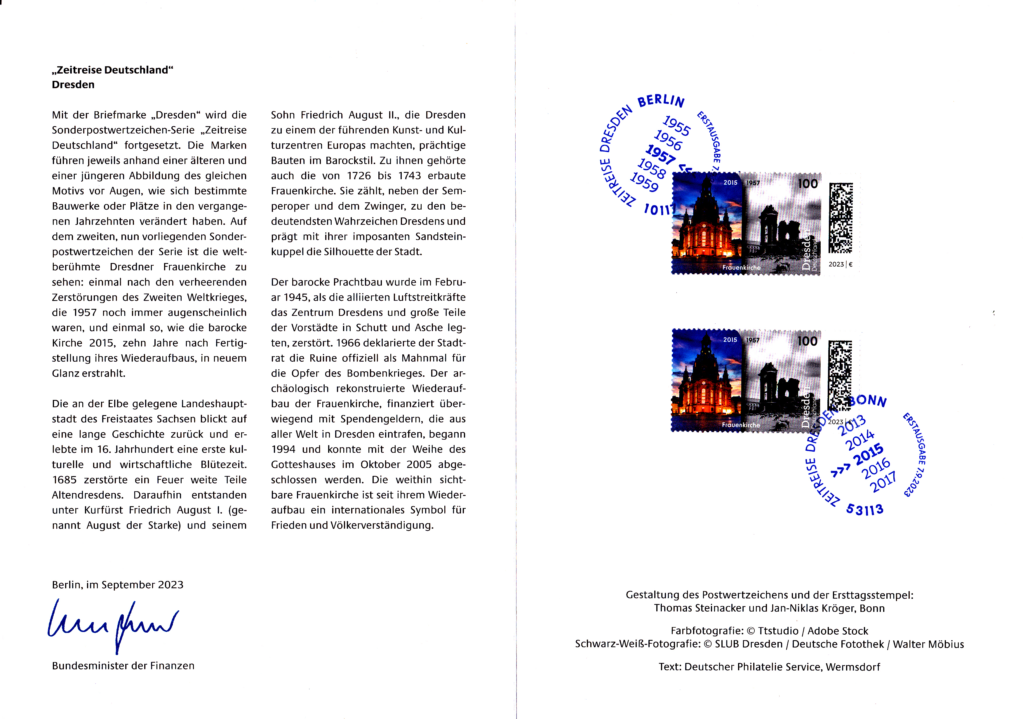 Ministerkarte des Bundesministers für Finanzen mit zwei Marken (MiNr 3785) mit dem Motiv " Frauenkirche in Dresden, auf Photographien der Jahre 2015 und 1957) aus der Serie "Zeitreise durch Deutschland " und den beiden Ersttagsonderstempel Bonn und Berlin.