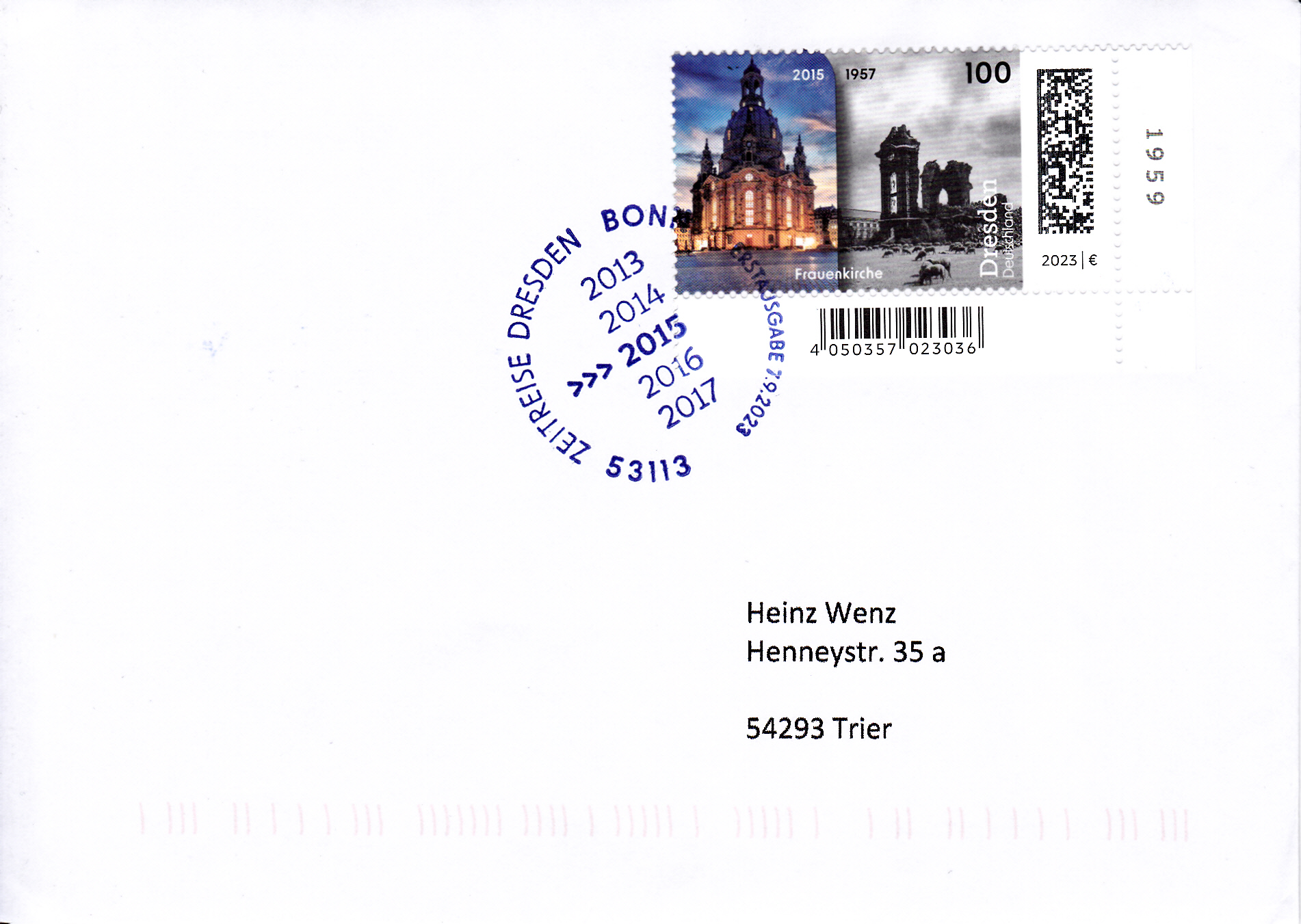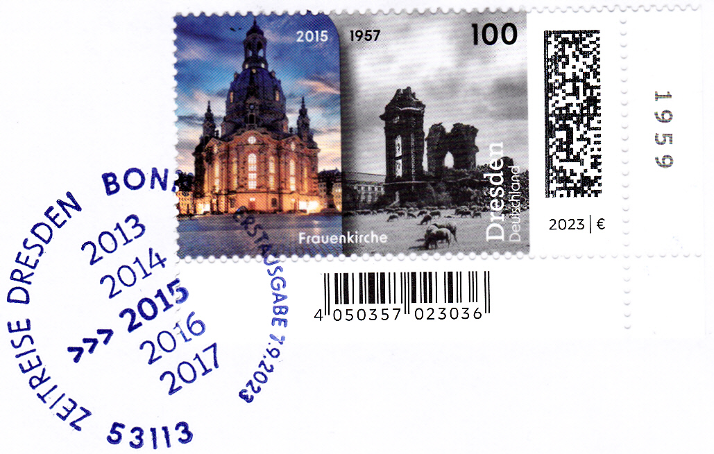 In der Serie "Zeitreise durch Deutschland" ist bei der Deutschen Post AG eine Marke (MiNr 3785) mit der Frauenkirche in Dresden auf Photographien der Jahre 2015 und 1957 erschienen.