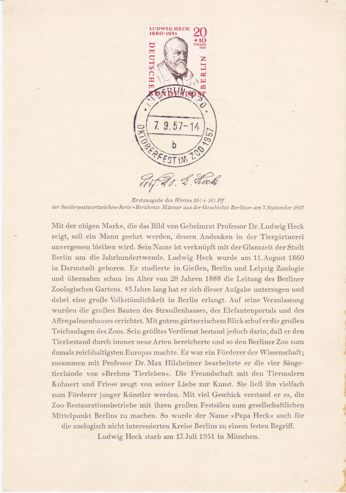 Prof. Ludwig Heck (geb. 11. Aug. 1860 in Darmstadt; gest. 17. Juli 1951 in München) war Biologe und Zoodirektor. Er wurde am 1. Juni 1886 zum Direktor des Kölner Zoos bestellt. Zum 1. Juni 1888 wechselte er als Direktor an den Zoologischen Garten Berlin, den er bis zum 31. Dezember 1931 leitete.