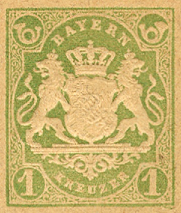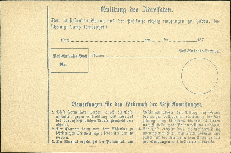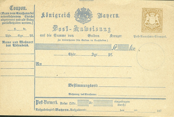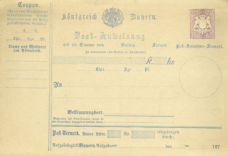 1874 gab Bayern diese Postanweisung (Maße: 173x119mm) mit einem Wertzeichen (violett) zu 12 Kreuzer heraus.