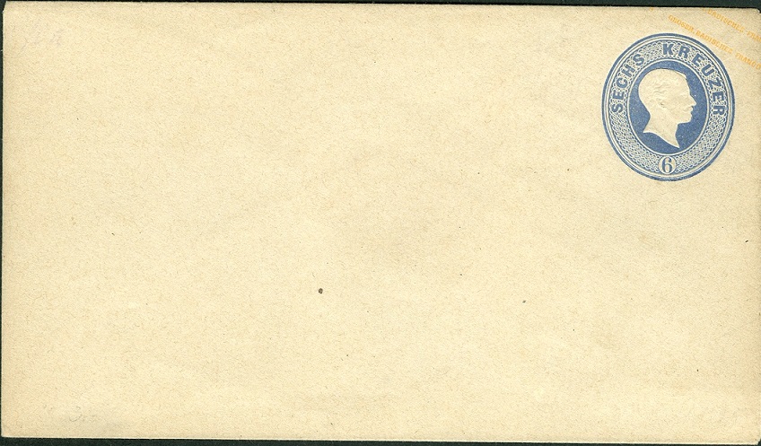 Der Wertstempel (6 Kreuzer, lebhaftultramarin, Prägedruck) und der gelborangefarbene Überdruck.