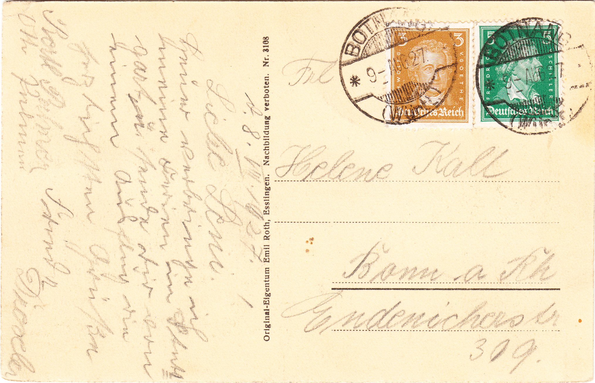Bei diesem Beispiel vom 09.08.1927 aus BOTNANG handelt es sich um einen im Deutschen Reich weiterverwendeten solchen württembergischen Stempel.