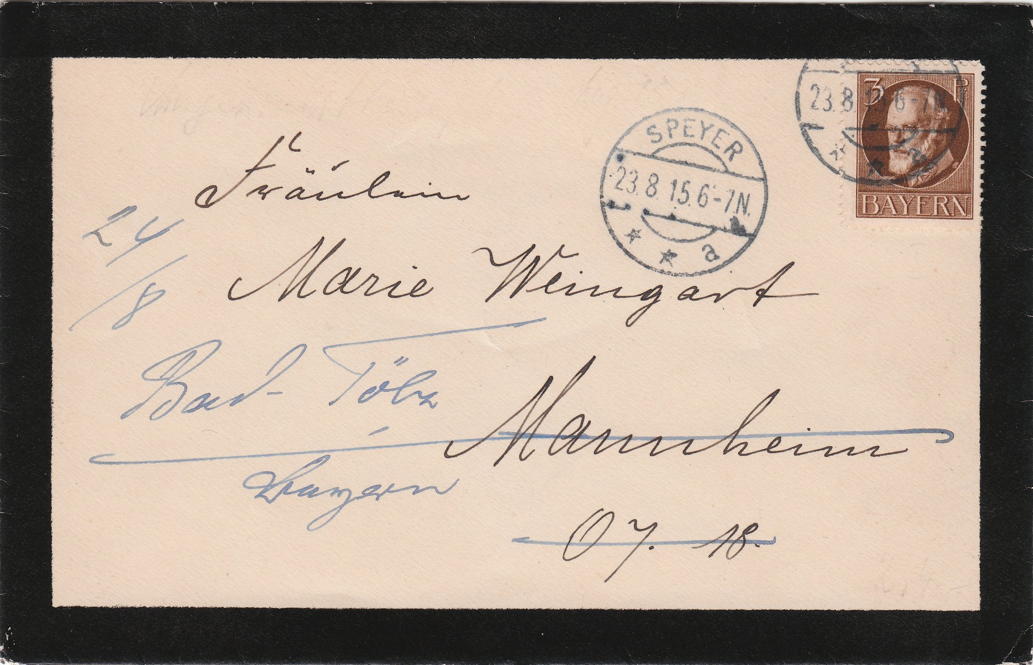 Dieses Exemplar in Briefform ist eindeutig als Trauerbrief zu identifizieren. Der Beleg wurde am 23.08.1915 in Speyer aufgegeben und ist nach Mannheim adressiert, lief also als Drucksache im Fernverkehr: