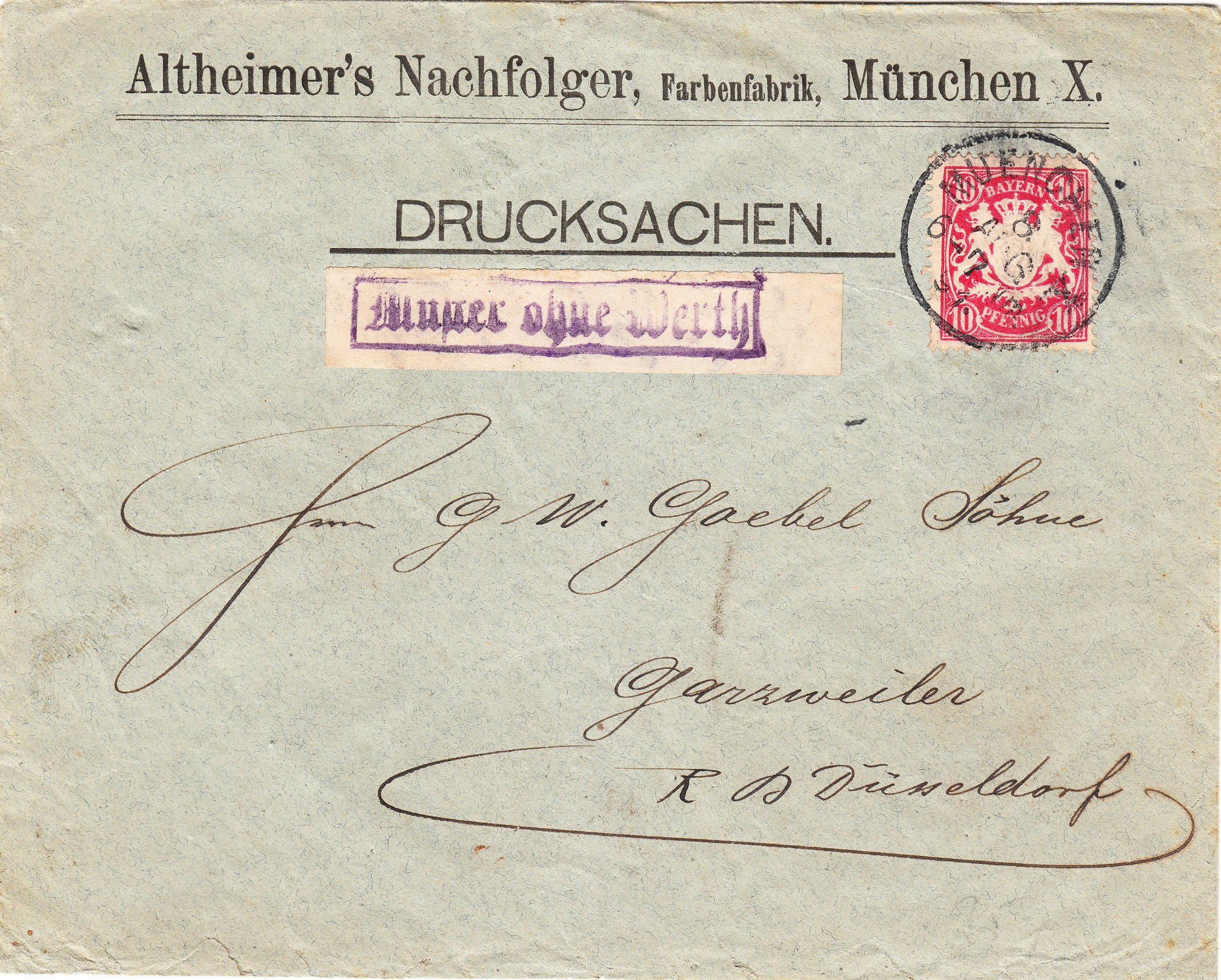 Hier die Sendungsart "Muster ohne Werth", heute würde man "Warensendung" dazu sagen, am 08.08.1891 frankiert mit 10 Pfennig von München nach Garzweiler im Regierungsbezirk Düsseldorf gelaufen: