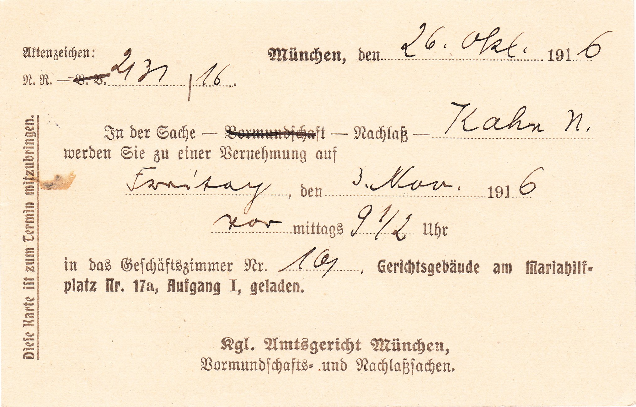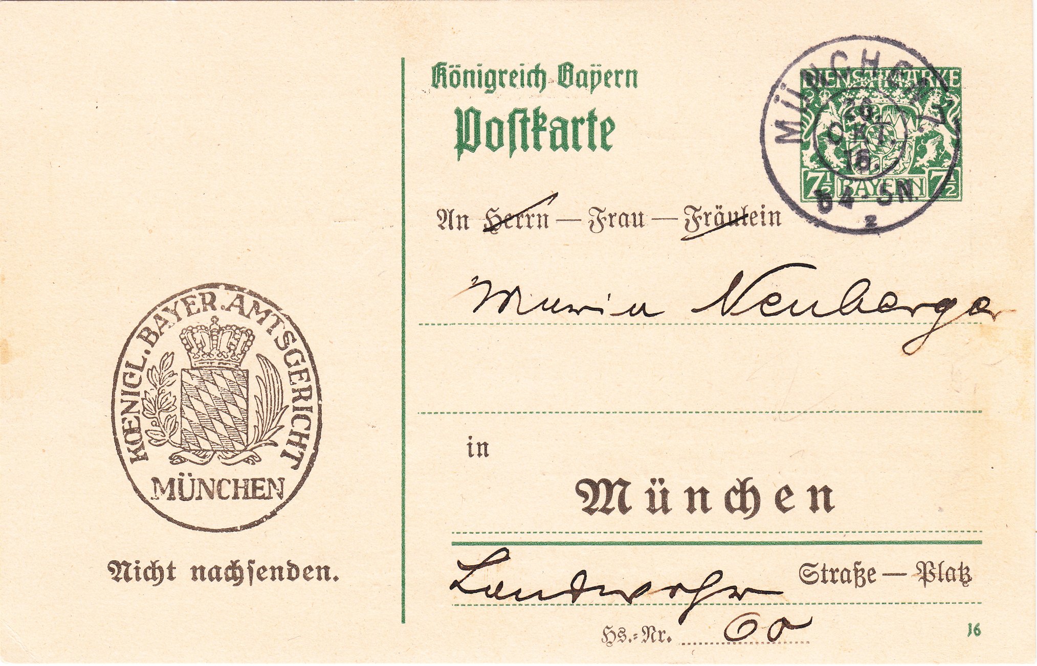 Diese Ganzsache aus dem Jahre 1916 hat einen Eindruck entsprechend des Postwertzeichens Dienstmarke MiNr. 25 aus Bayern mit einem beidseitigen Zudruck des Königlich Bayerischen Amtsgerichts in München in Schwarz: