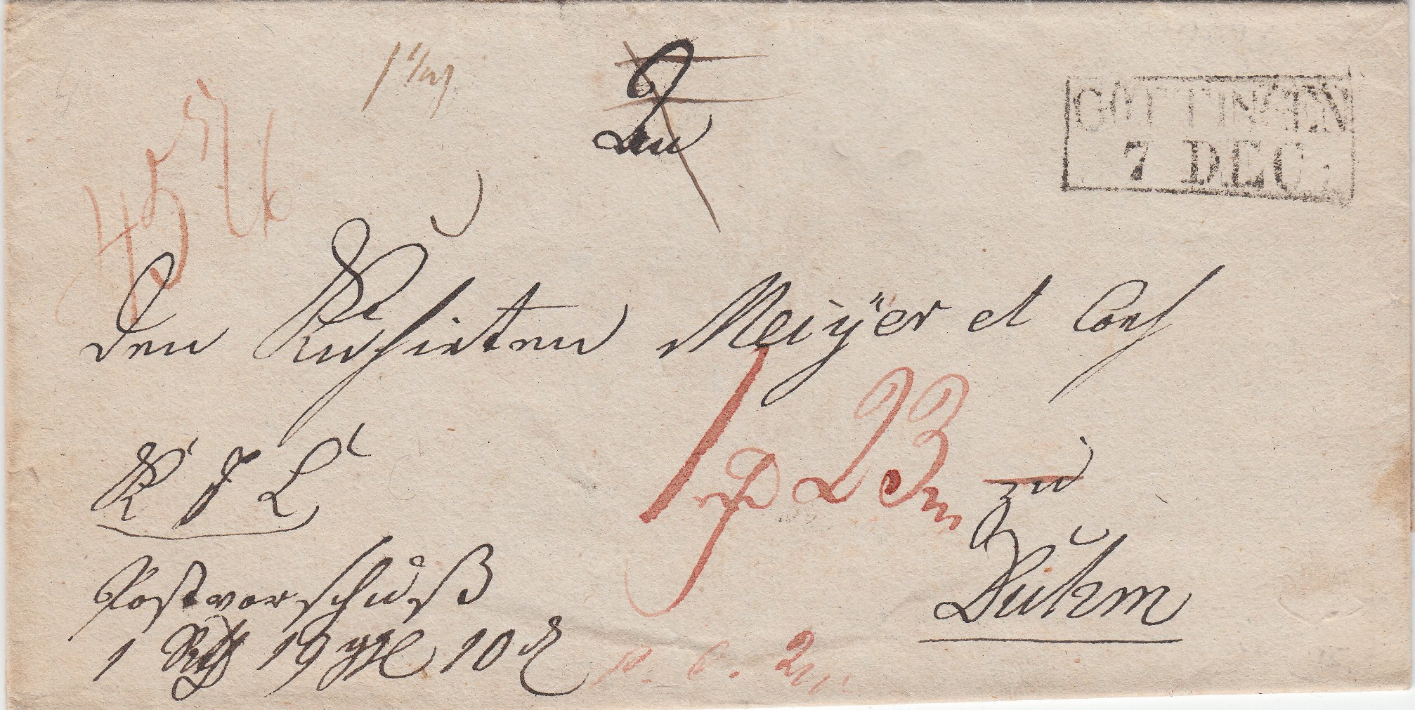 Dieser nach "Duhm", heute ein Ortsteil von Katlenburg-Lindau in Niedersachsen, am 07.12. in Göttingen aufgegebene Brief war laut handschriftlichem Vermerk belegt mit "Postvorschuß 1 Reichsthaler, 19 Gute Groschen, 10 Pfennige":
