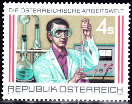 Aus Österreich kommt eine Marke der Serie "Die österreichische Arbeitswelt" (MiNr 1939) mit einem Chemielaboranten.