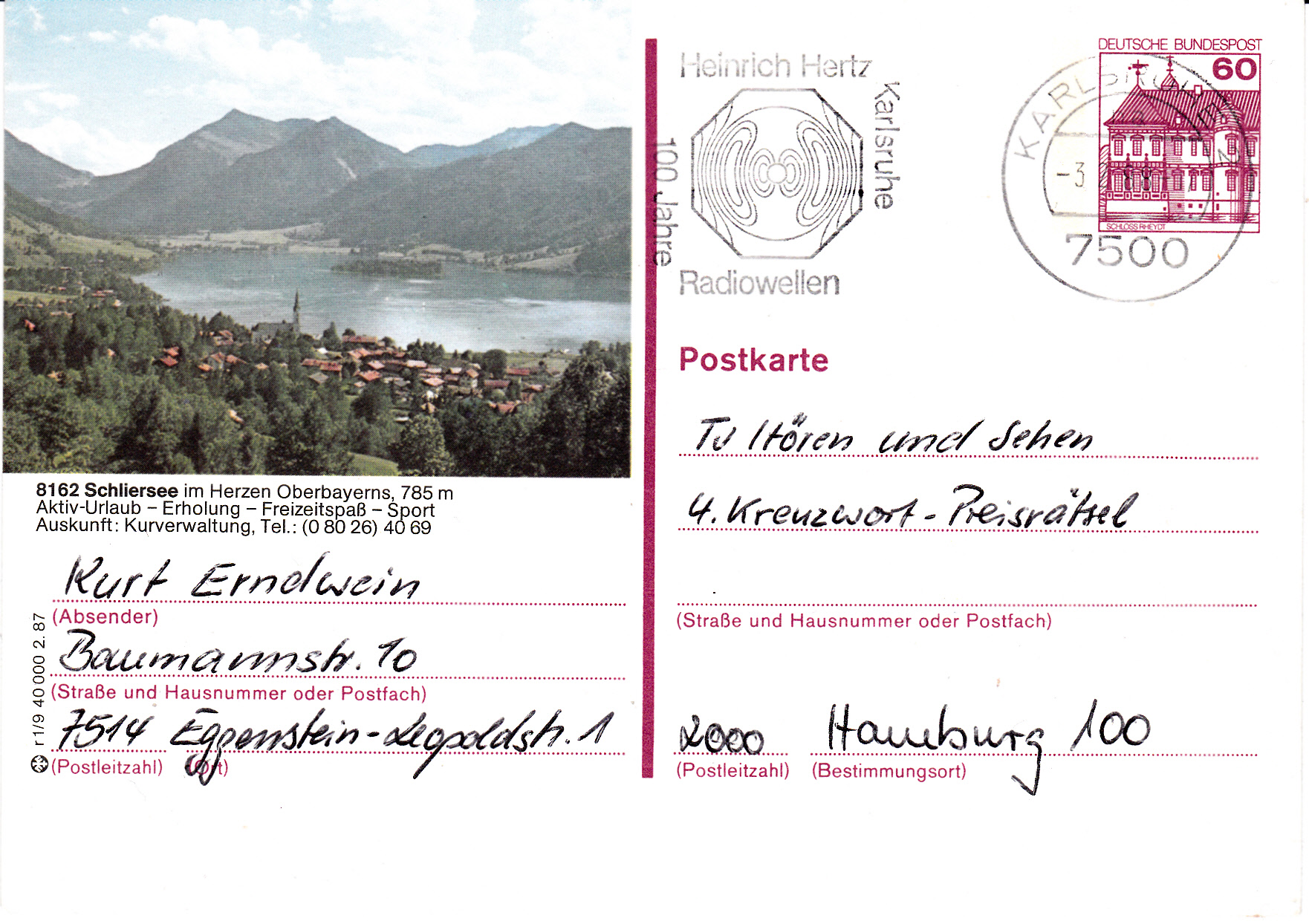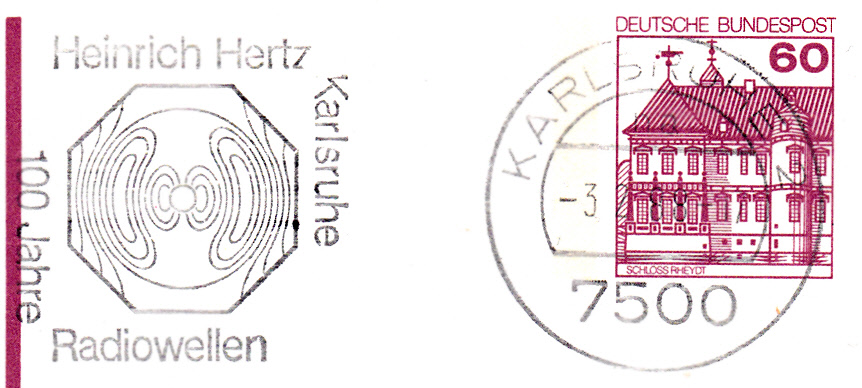 Maschinenwerbestempel aus 7500 Karlsruhe 2 vom 3.2.1988 mit einem Werbeeinsatz "Heinrich Hertz Karlsruhe 100 Jahre Radiowellen" und einer bildlichen Darstellung von Radiowellen.