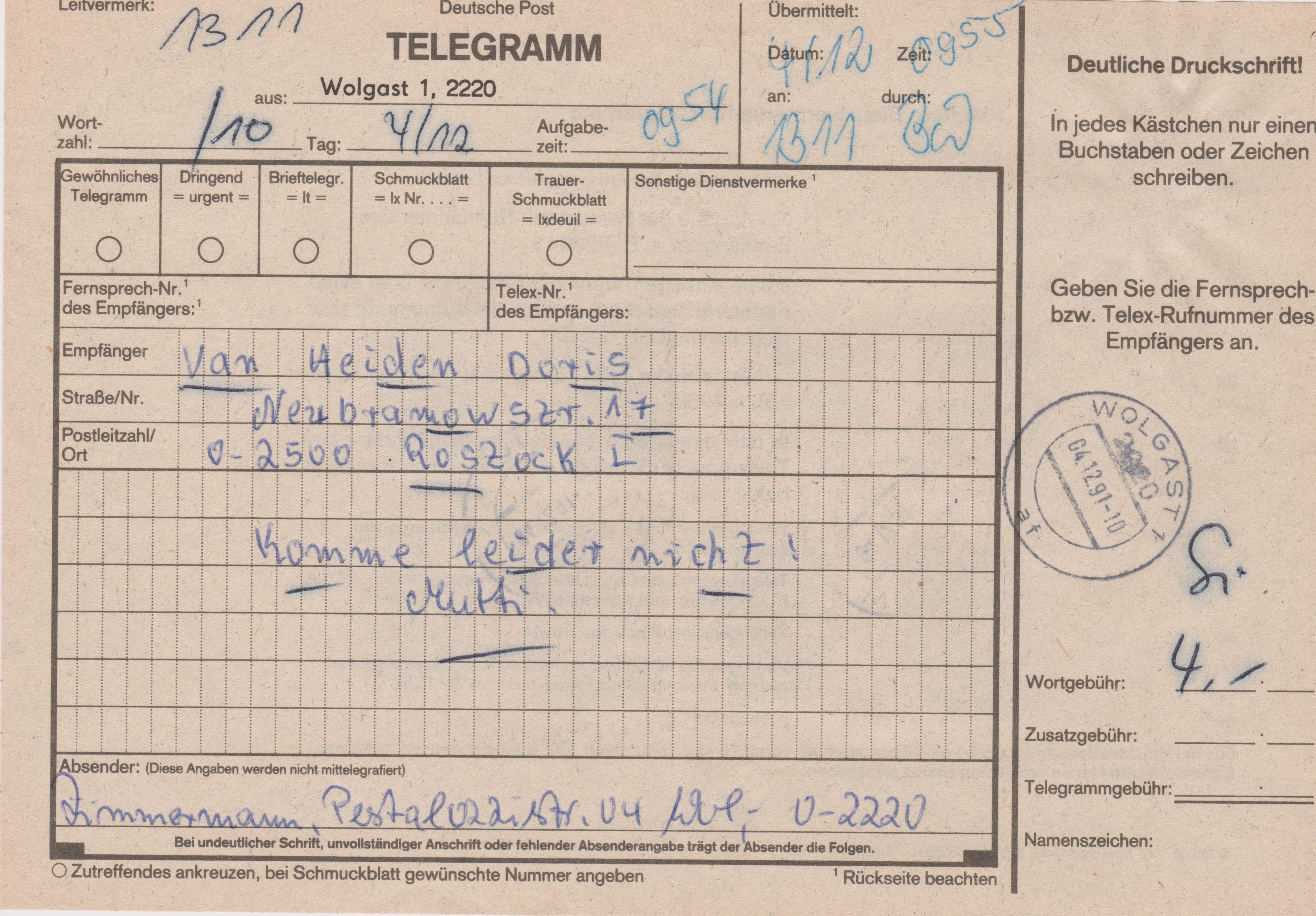 Den Anfang macht heute dieses Postformular aus dem VGO, verwendet am 04.12.1991: