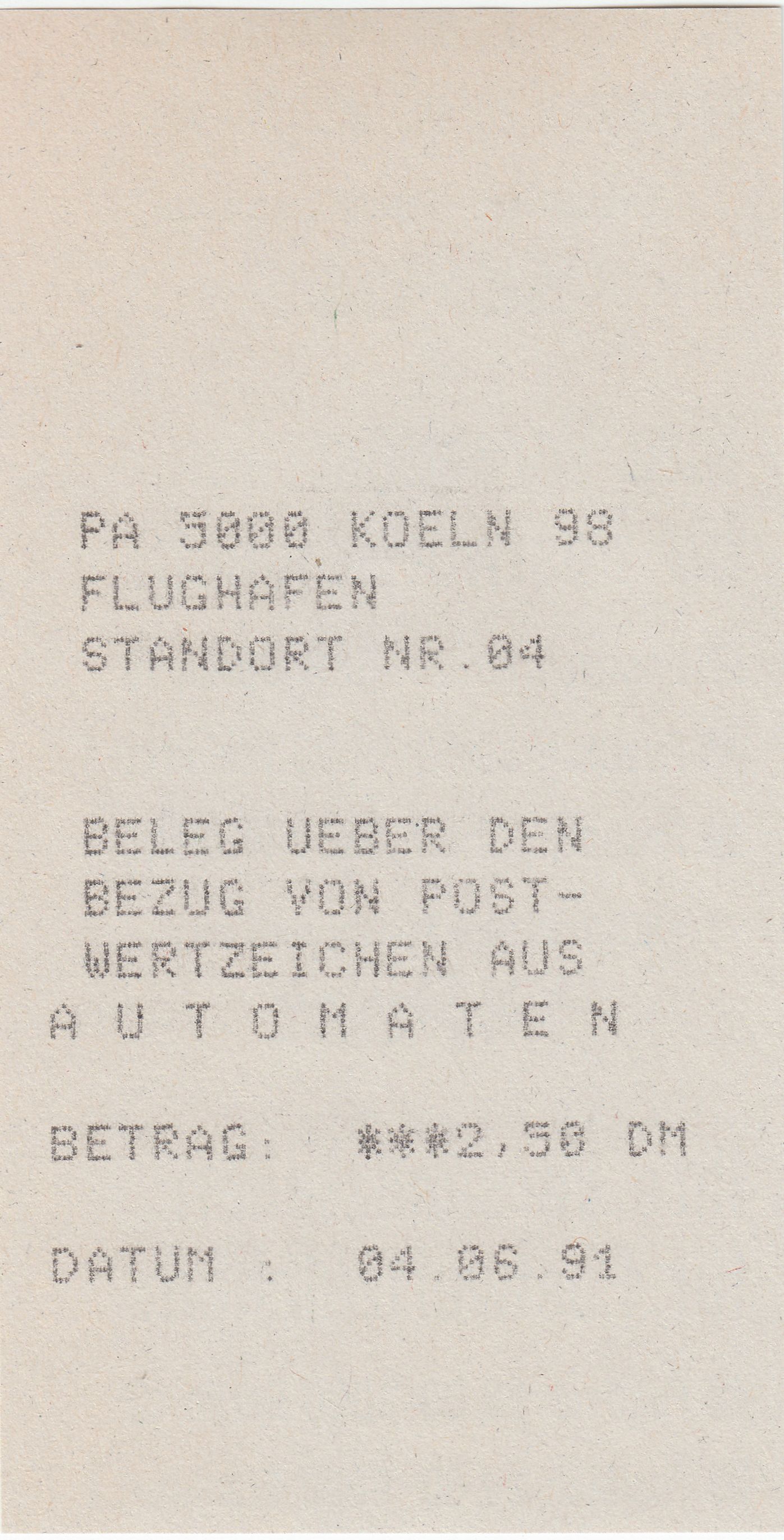 Zu diesem Beleg liegt die Quittung zum Kauf der ATM der Wertstufe 250 Pf am Automaten am Standort 4 im PA 5000 Köln 98 Flughafen vor: