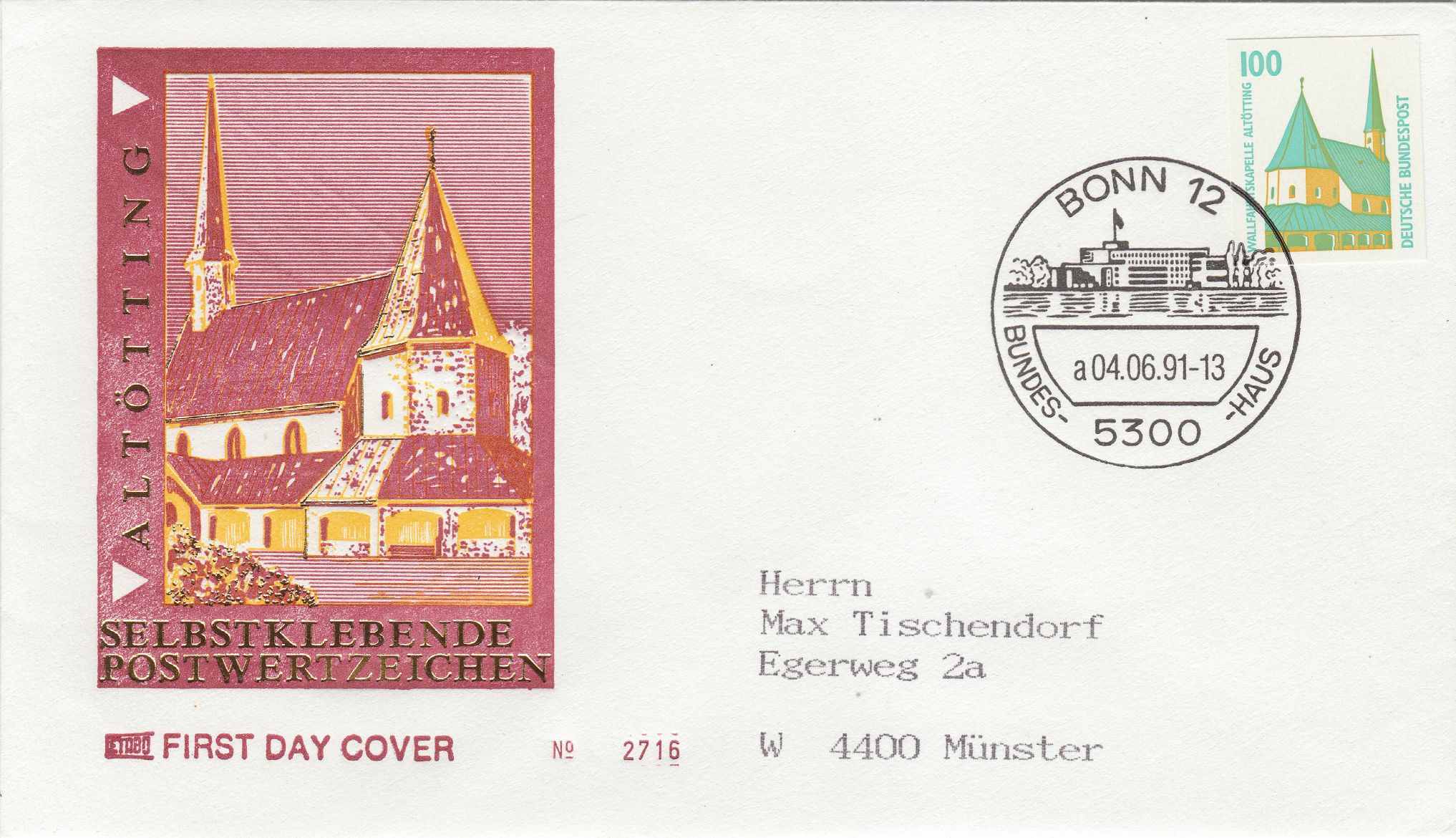 EF der Wertstufe 100 Pf portorichtig auf Standardbrief, am 04.06.1991 als erstem Verwendungstag auf Schmuck-"FDC". Da das Motiv in anderer Trennungsart bereits erschienen war legte die Deutsche Bundespost keinen speziellen Ersttagssonderstempel auf, sondern entwertete per Handwerbestempel "BONN 12 BUNDESHAUS".