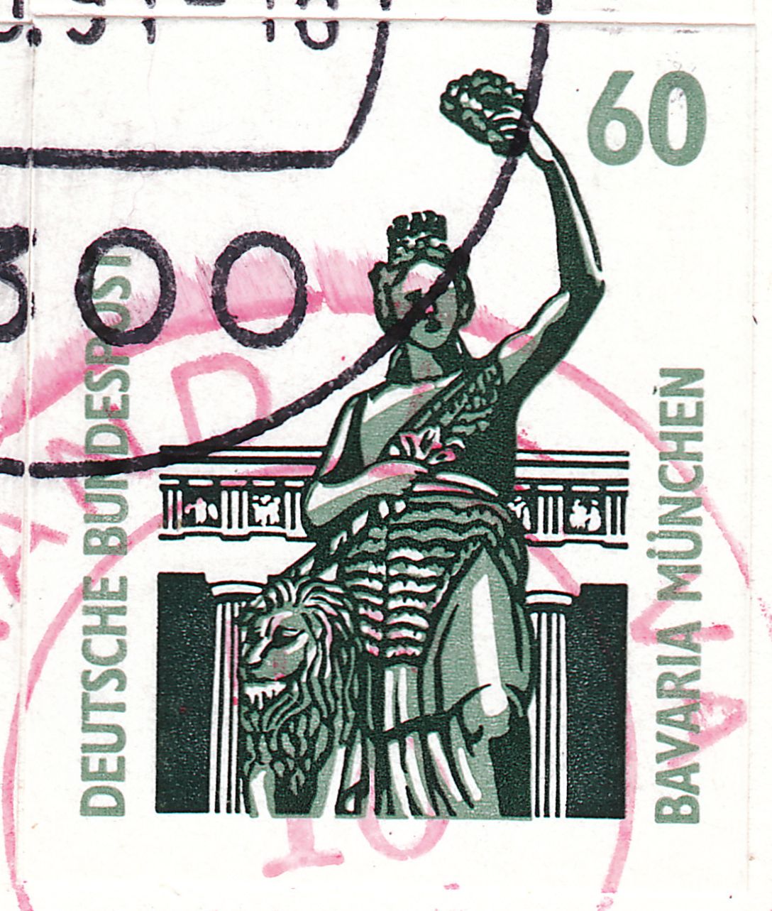 Kompletter Inhalt des MH 27, in der Anordnung des MH 27 als MiF verklebt auf einem Brief mit einem Gewicht von 16 bis 20 g in die USA (140 Pf) per Einschreiben (250 Pf) und Luftpost (25 Pf je 5 g, hier 4 x 25 Pf = 100 Pf), somit der Portostufe 490 Pf entsprechend mit 10 Pf überfrankiert. Die untere Marke der Wertstufe 60 Pf zeigt den auf Feld 6 des MH 27 vorkommenden Plattenfehler "Fleck über dem N von MÜNCHEN":