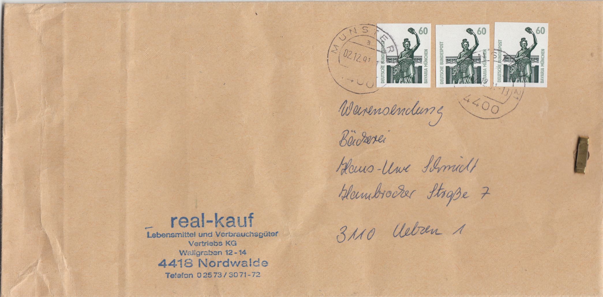 MeF der Wertstufe 60 Pfennig portorichtig auf Warensendung von 101 bis 250 g, Porto 180 Pf, aufgegeben am 02.12.1991 in Münster 1.