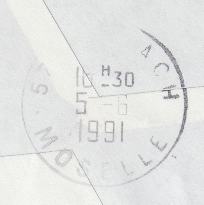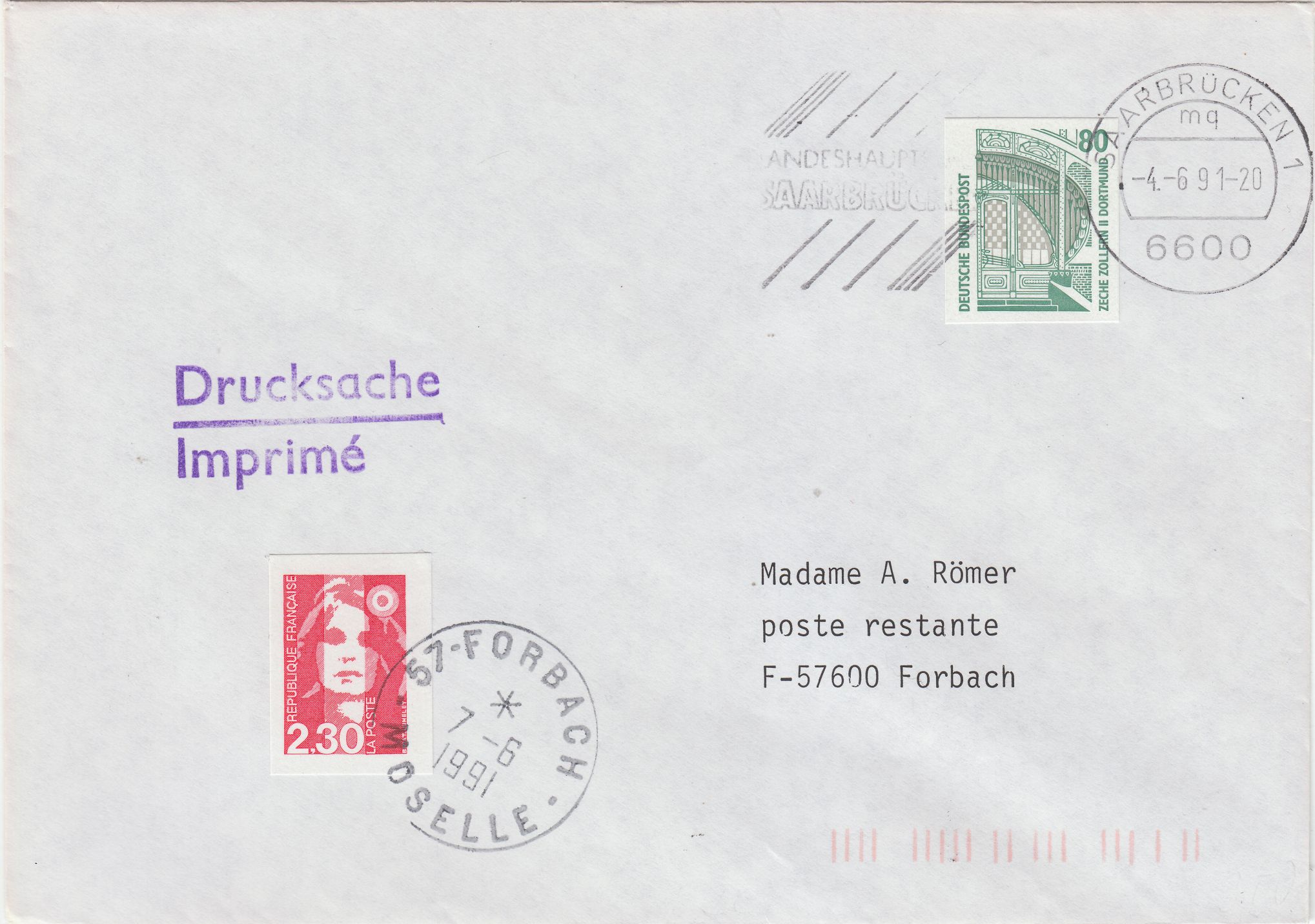 Auslandsdrucksache bis 20 g, am 04.06.1991 als erstem offiziellen Verwendungstag der selbstklebenden Postwertzeichen portorichtig als EF mit 80 Pf frankiert. Laut rückseitigem Ankunftsstempel kam der Beleg in Forbach in Frankreich am 05.06.1991 an. Die Empfängerin mußte am 07.06.1991 bei der Abholung 2,30 Francs als Postlagergebühr zahlen, was ein französisches Postwertzeichen dokumentiert.