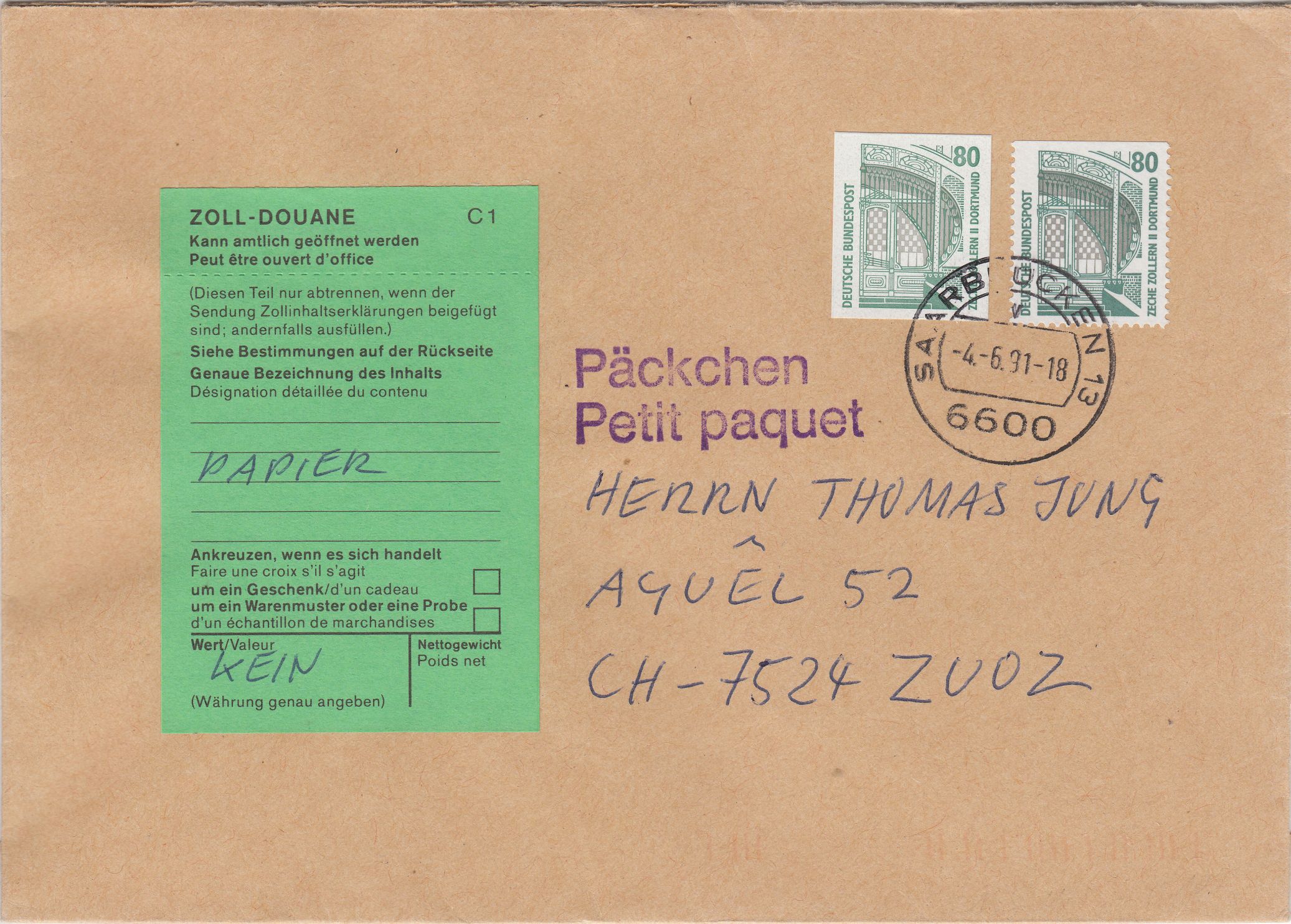 Foren-Übersicht Fragen und Diskussion Deutschland Deutschland ab 1945 Bundesrepublik Deutschland Dauerserien Dauerserie - Sehenswürdigkeiten (SWK) Ein Exponat entsteht Ein Exponat entsteht: Ausgabe Mai 1991 = MH 27 Das philatelistische Material MiF 80 + 80 auf "Päckchen/Petit paquet" in die Schweiz