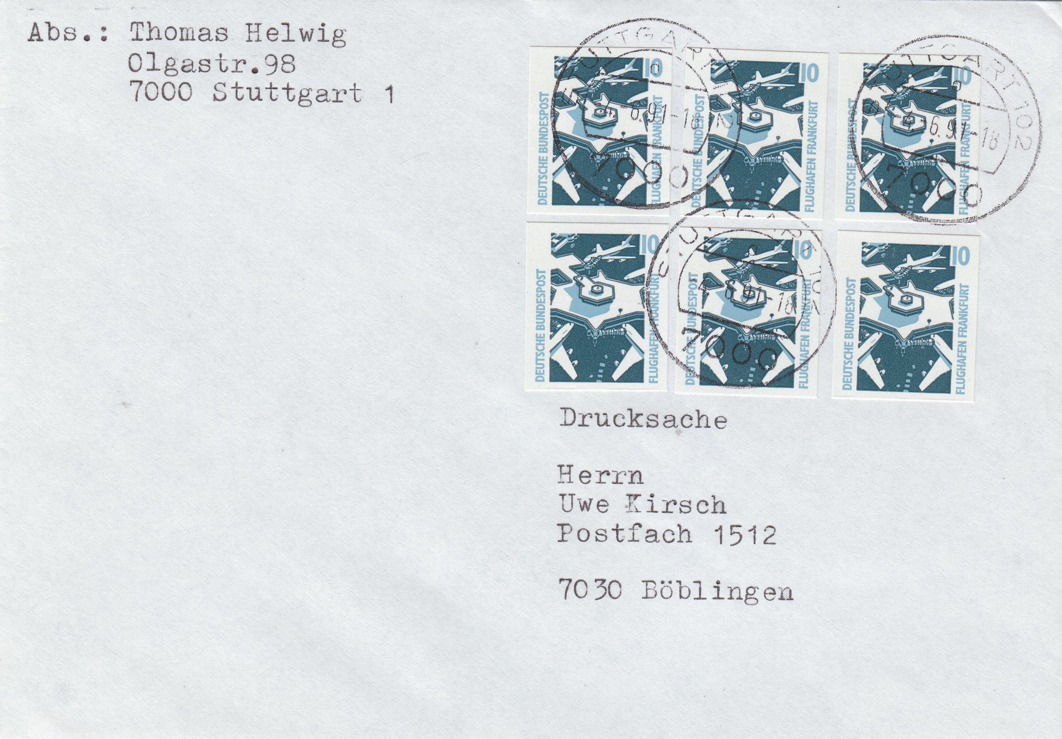 MeF von 6 Werten zu 10 Pf am 04.06.1991 als erstem Verwendungstag portorichtig auf Standarddrucksache.