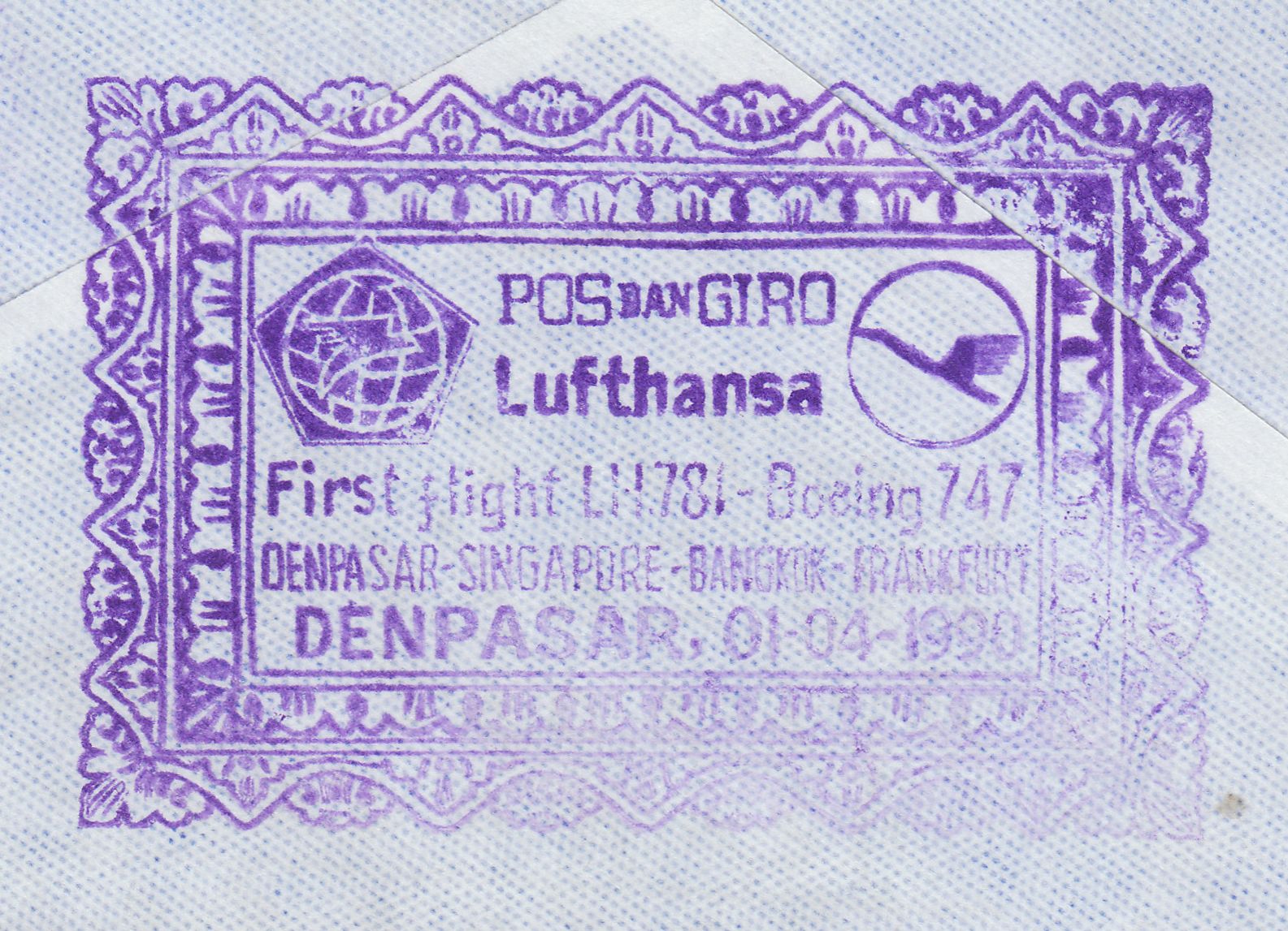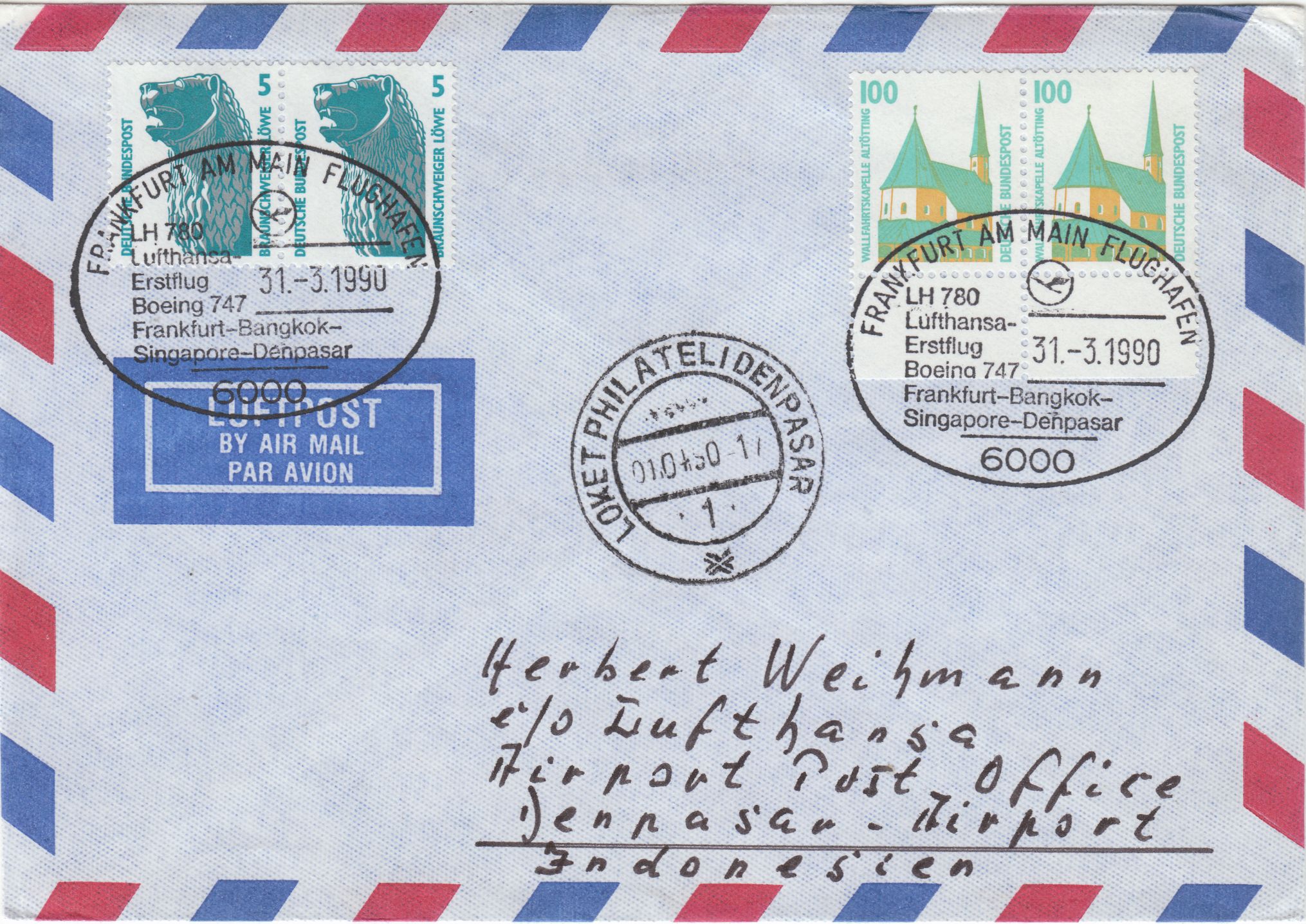 MiF 2x5 Pf + 2x100 Pf am 31.03.1990 als Letzttag dieser Portostufe portorichtig auf Auslandsbrief (140 Pf) per Luftpost (35 Pf je 5 g = hier 70 Pf), laut zur Entwertung verwendetem Sonderstempel FRANKFURT AM MAIN FLUGHAFEN befördert auf dem Lufthansa-Erstflug LH 780 in einer Boeing 747 von Frankfurt über Bangkok und Singapore nach Denpasar in Indonesien, wo am 01.04.1990 vorderseitig ein Ankunftsstempel abgeschlagen wurde.