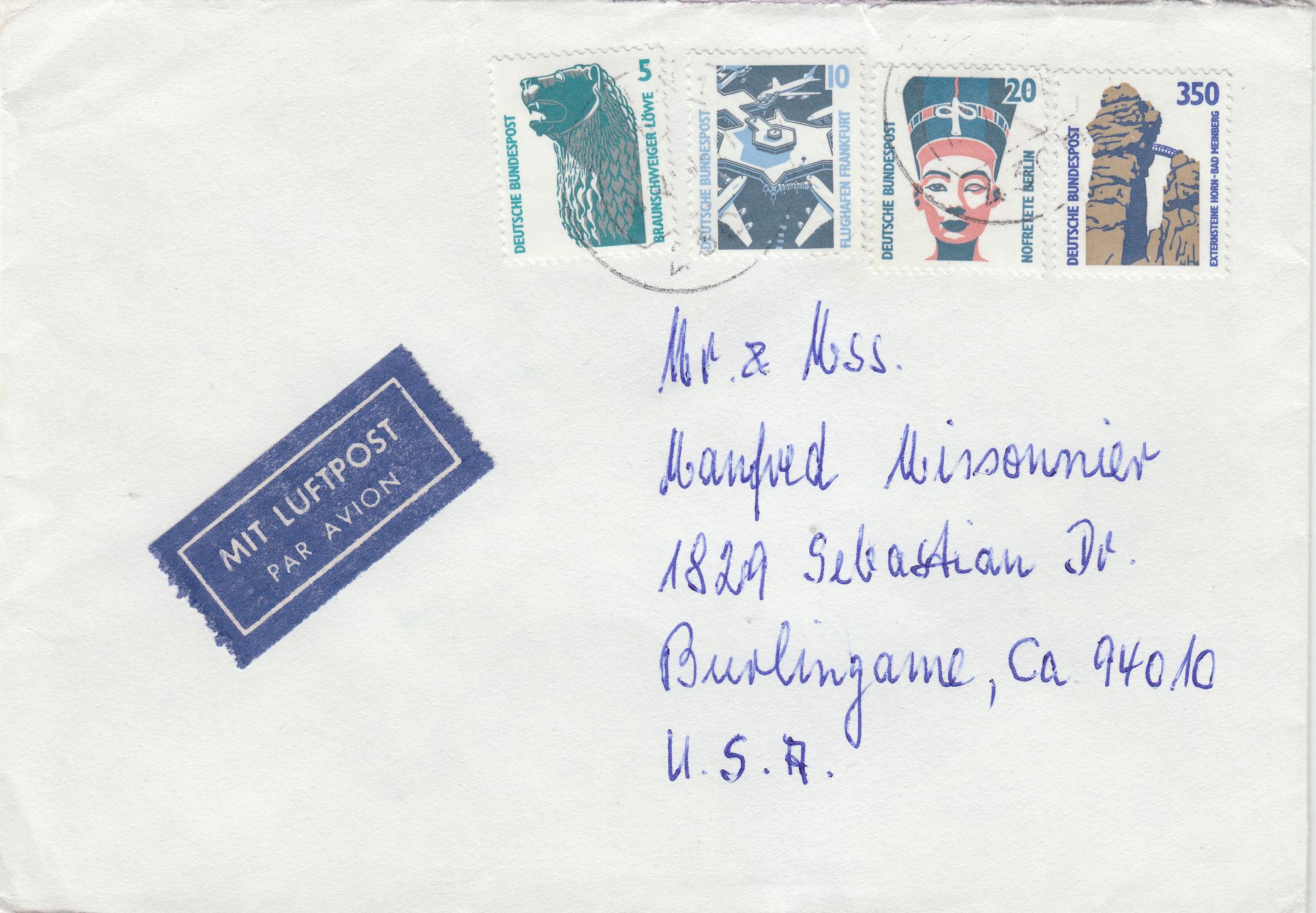 MiF der Wertstufen 5 Pf, 10 Pf, 20 Pf sowie 350 Pf, vom 15.02.1990 bis zum 31.03.1993 portorichtiger Auslandsbrief, Porto 210 Pf bei 21 bis 50 g, per Luftpost in die USA (25 Pf Luftpostgebühr für je 5 g, hier 175 Pf für 31 bis 35 g) ergibt die seltene Portostufe 385 Pf.