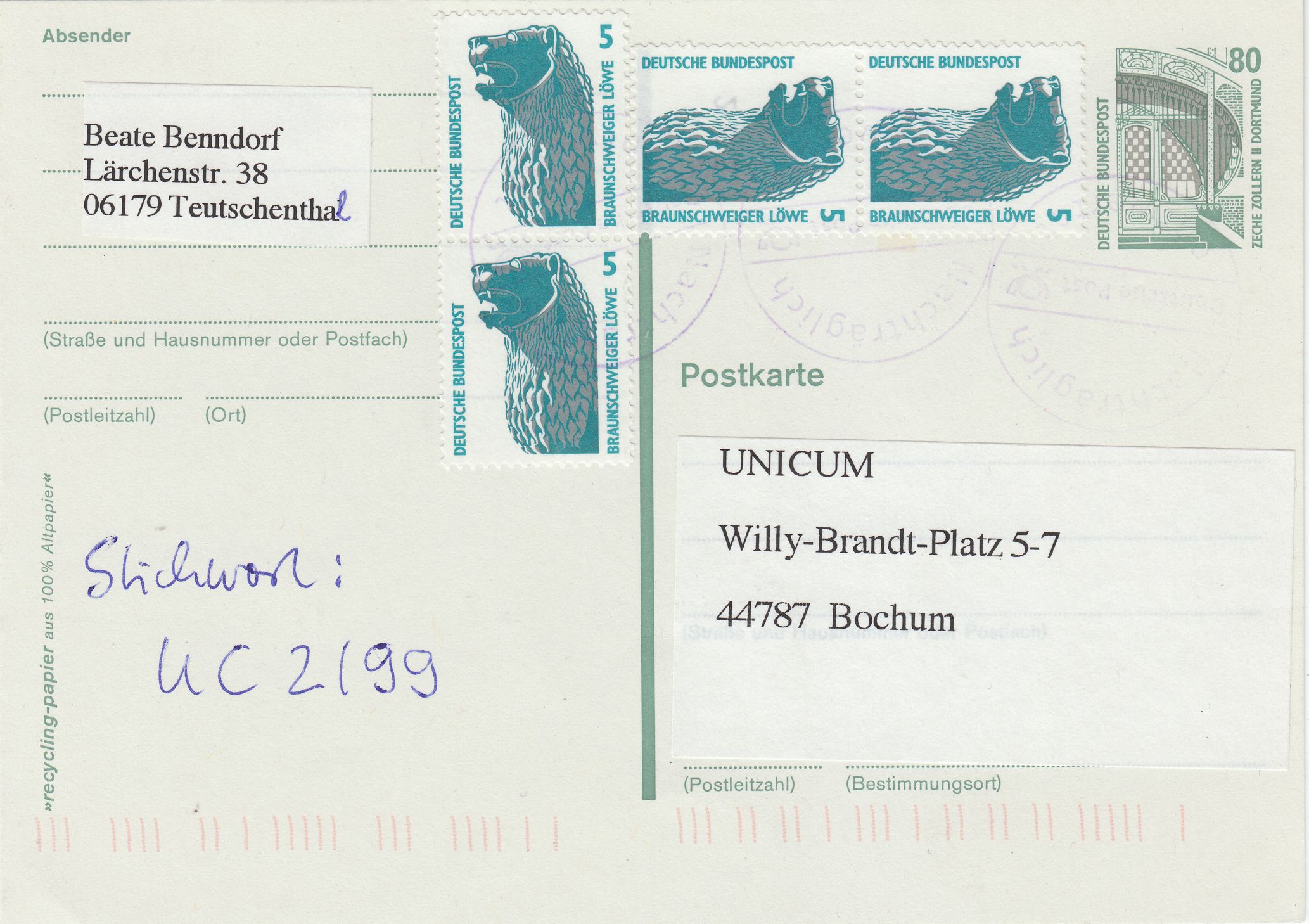 MiF 4x5 Pf als Zusatzfrankatur auf einer Ganzsache mit Wertzeicheneindruck der Wertstufe 80 Pf, portorichtig möglich vom 01.09.1997 bis zum 31.12.2001, "Nachträglich entwertet".