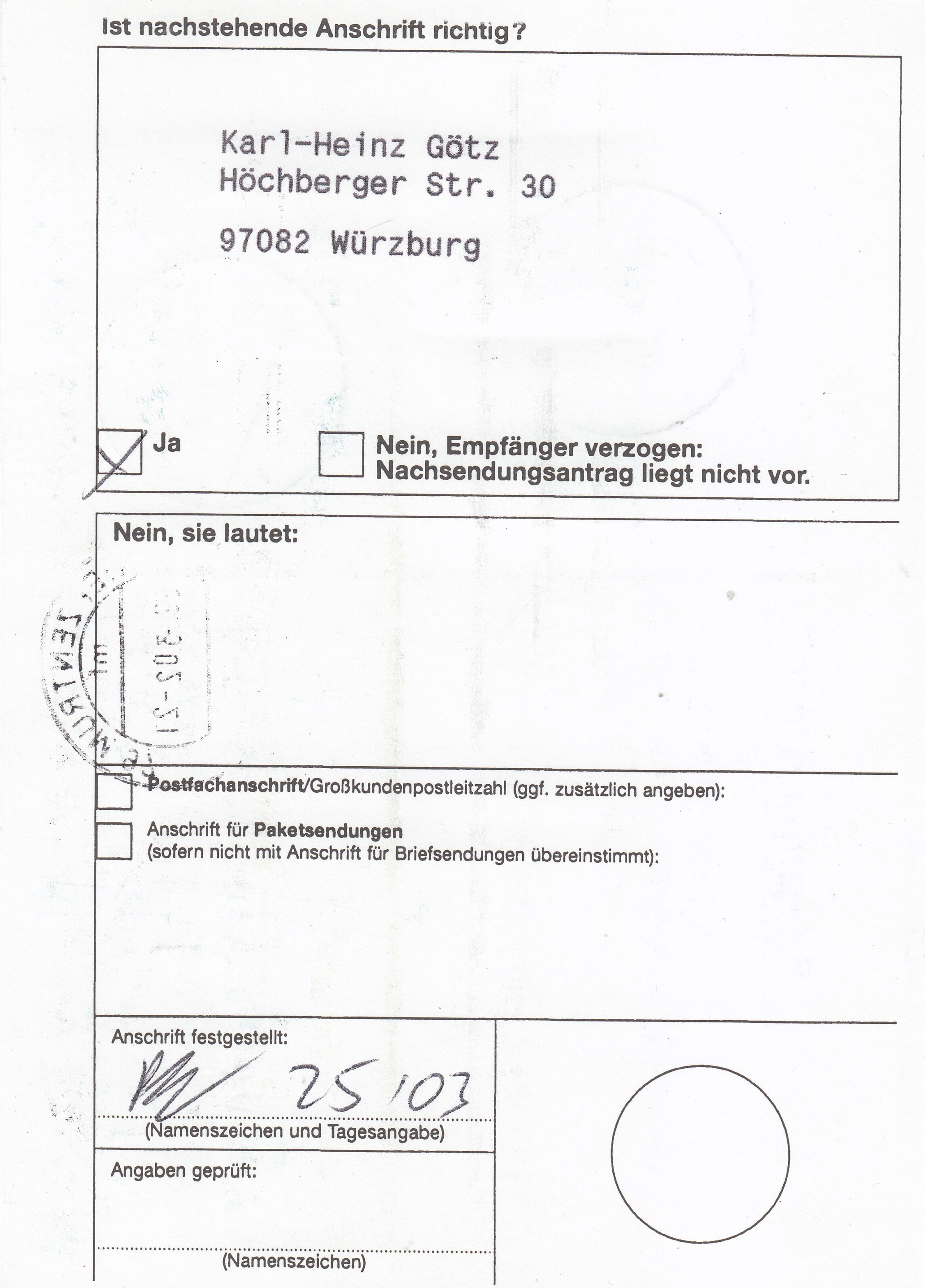Bis März 2000 erfolgte rückseitig ein Tagesstempelabdruck des die Anschrift prüfenden Postamtes. Diese Art der Dokumentation der durchgeführten Anschriftenprüfung wurde danach eingestellt, wie man an diesem Beispiel erkennt:
