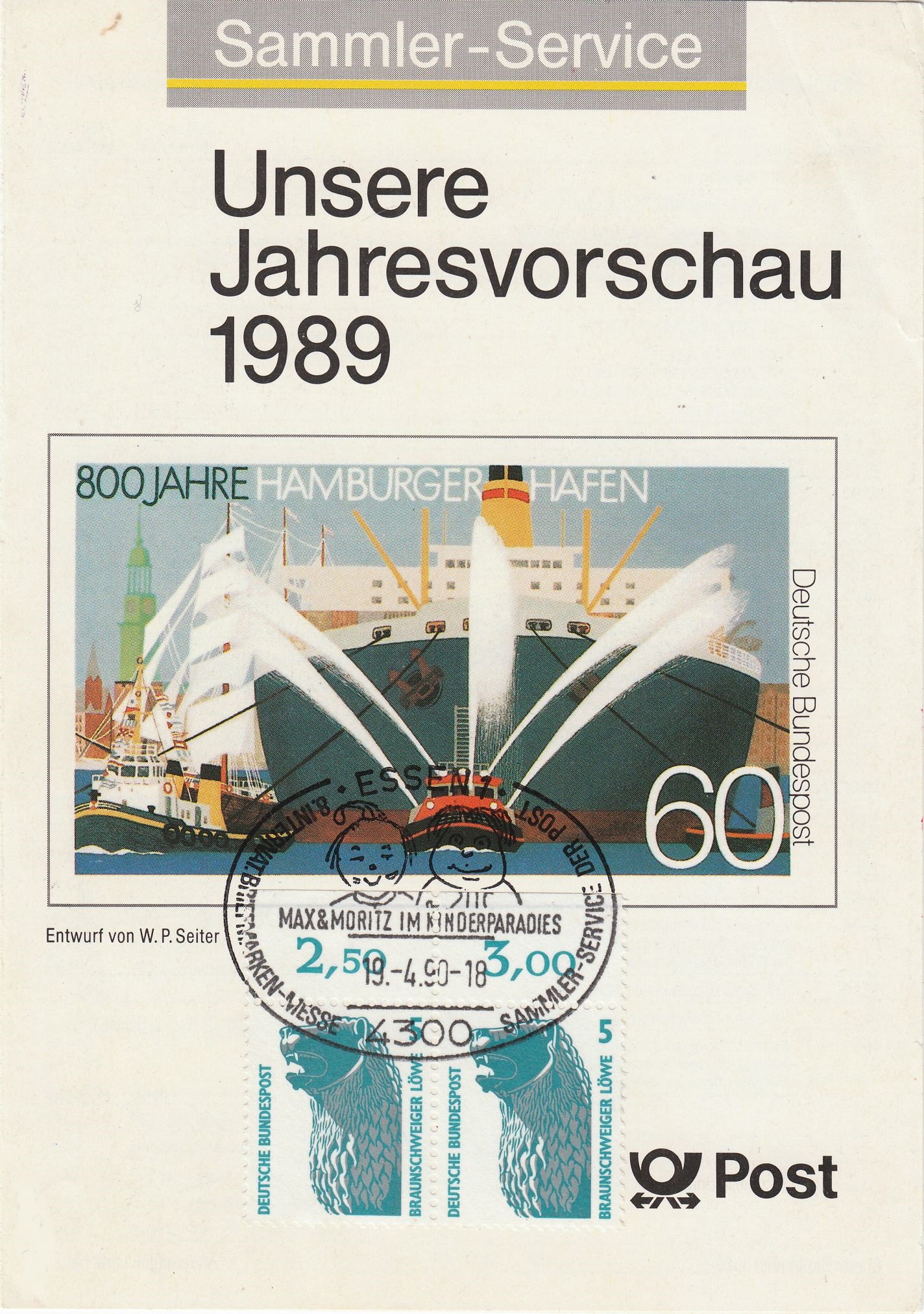 Ein Paar Bogenmarken der Wertstufe 5 Pf vom Oberrand mit den Reihenwertzählern "2,50" und "3,00", also von den Feldern 5 und 6 des 100er Bogens stammend, wurde am 19.04.1990 auf dem Faltblatt "Unsere Jahresvorschau 1989" verklebt, um bei der Messe in Essen einen Handwerbestempel darauf abgeschlagen zu bekommen.