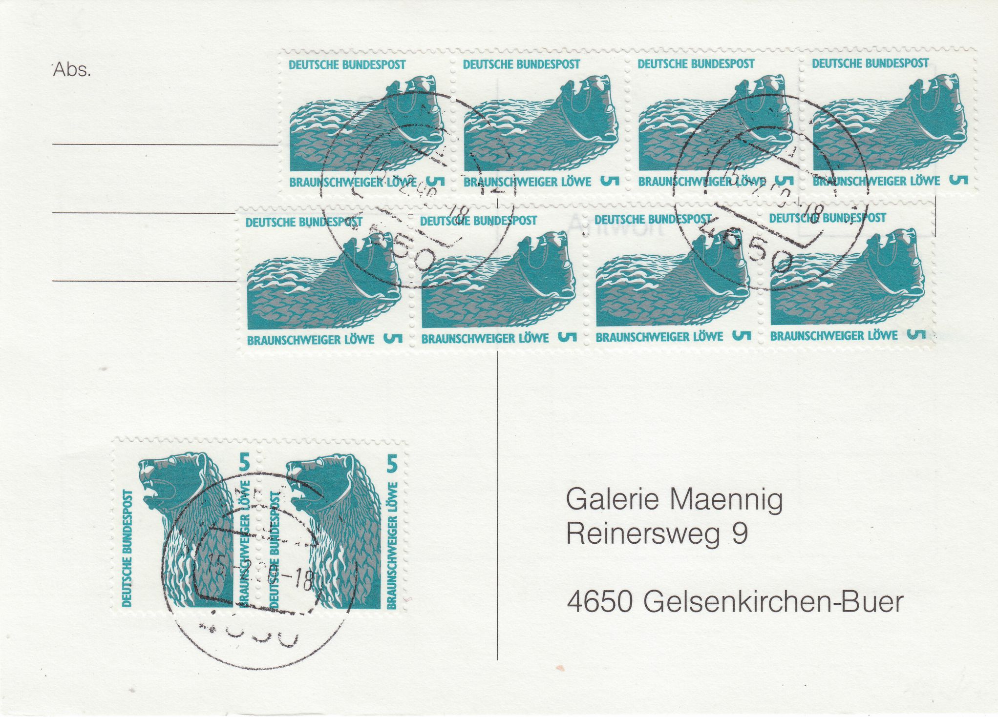 Hier eine MeF von 10 Stück der Wertstufe zu 5 Pf auf unterfrankierter Drucksache, denn das Porto für eine Standarddrucksache betrug 60 Pf: