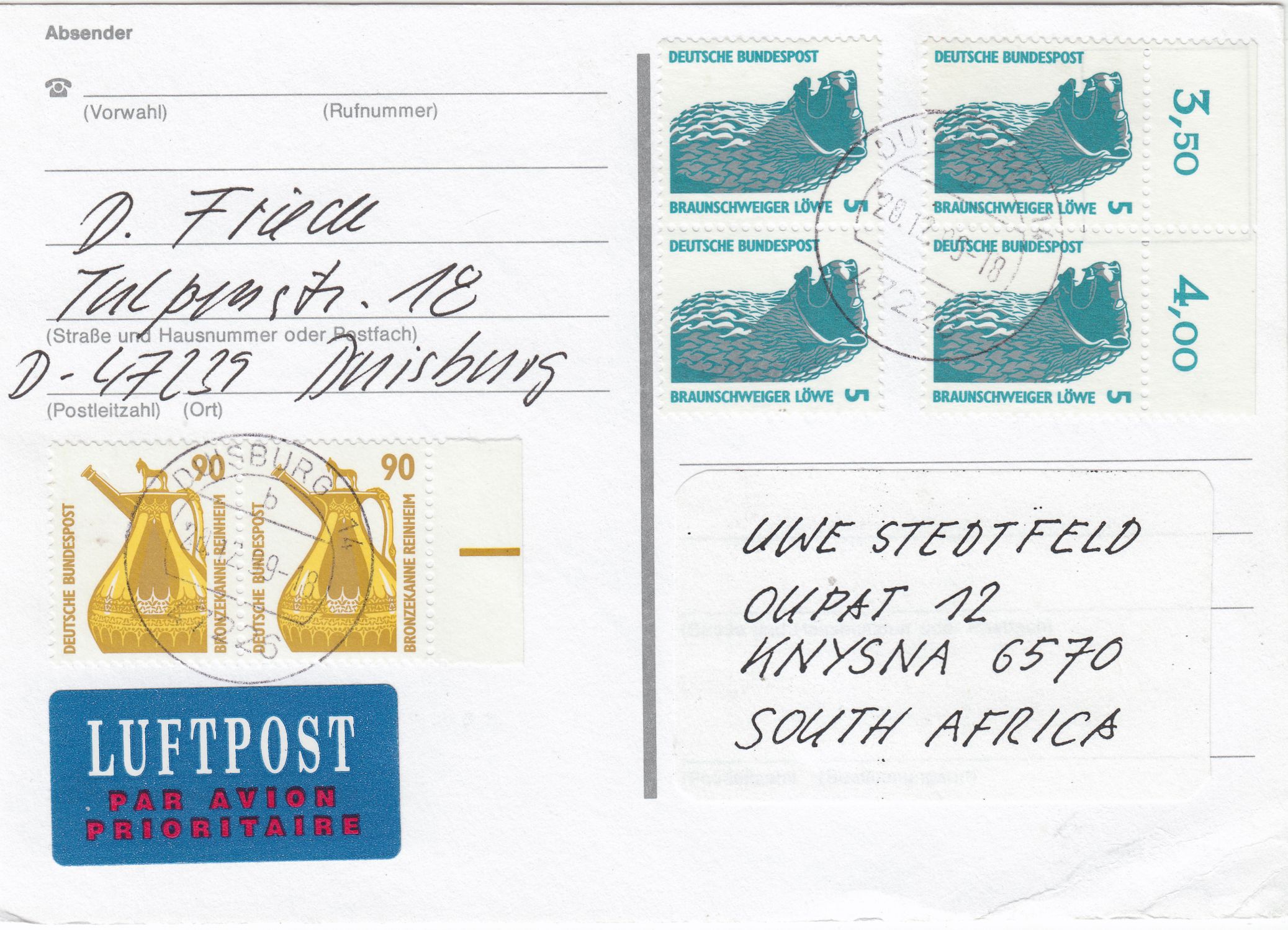 MiF 5 Pf (4) in Form von 2 Paaren sowie 90 Pf (2) in Form eines Paares vom rechten Bogenrand, am 20.12.1999 portorichtig auf Postkarte (Welt) (200 Pf).