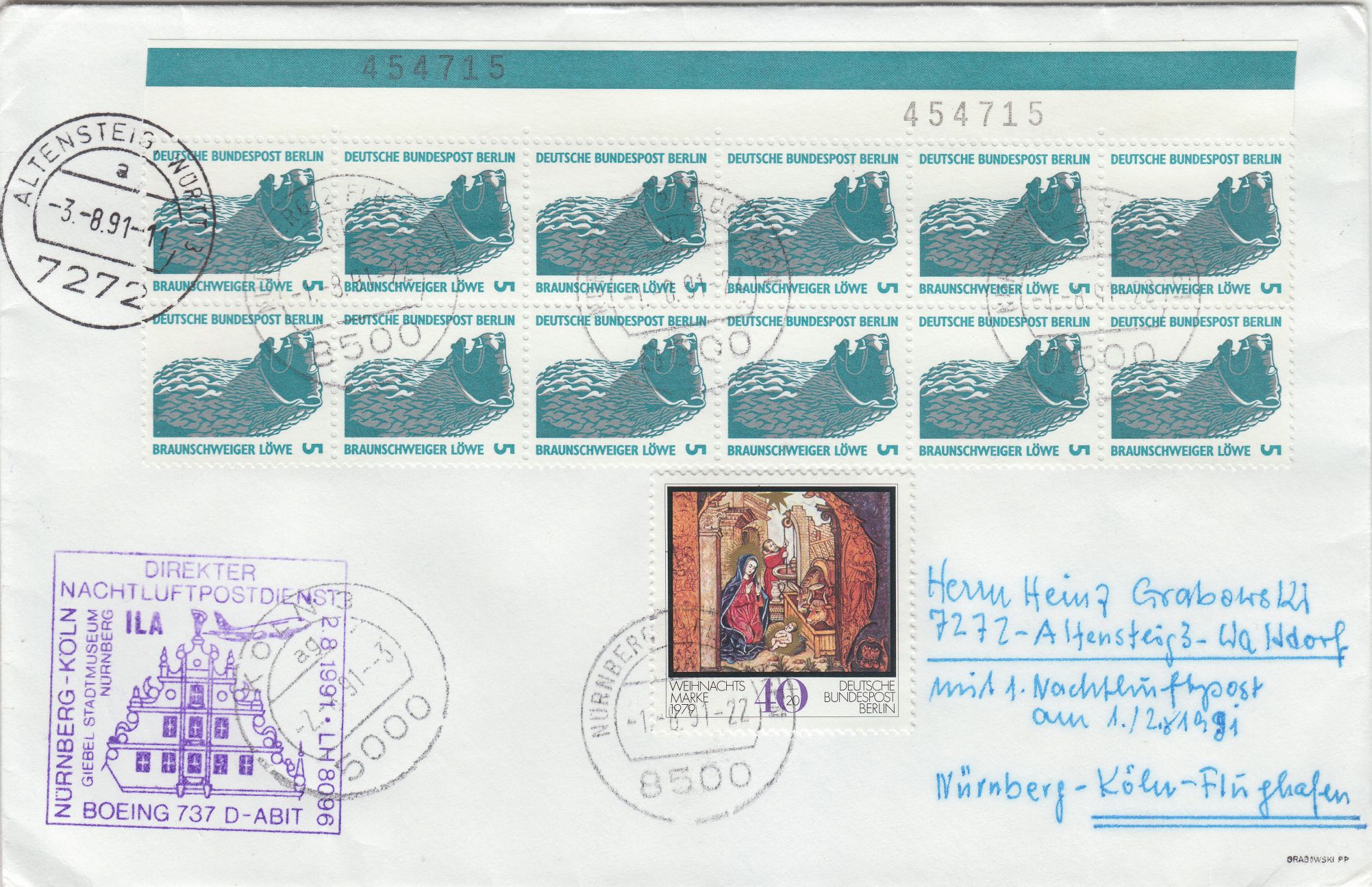 Zwölferblock der Wertstufe 5 Pf vom linken Rand mit Bogenzählnummern "454715" auf Standardbrief (100 Pf) in MiF mit einer Weihnachtsmarke 1979 Berlin der Wertstufe 40 Pf, am 01.08.1991 ab NÜRNBERG 2 FLUGHAFEN, laut Flugbestätigungsstempel befördert mit der ersten Nachtluftpost LH 8096 per BOEING 737 D-ABIT vom 01.08.1991 auf den 02.08.1991 von Nürnberg nach Köln, wo am 02.08.1991 um 3 Uhr früh ein Tagesstempel als Ankunftsstempel abgeschlagen wurde. Der Beleg wurde dann an seinen Bestimmungsort ALTENSTEIG weitergeleitet, wo am 03.08.1991 um 11 Uhr ein Tagesstempel abgeschlagen wurde.