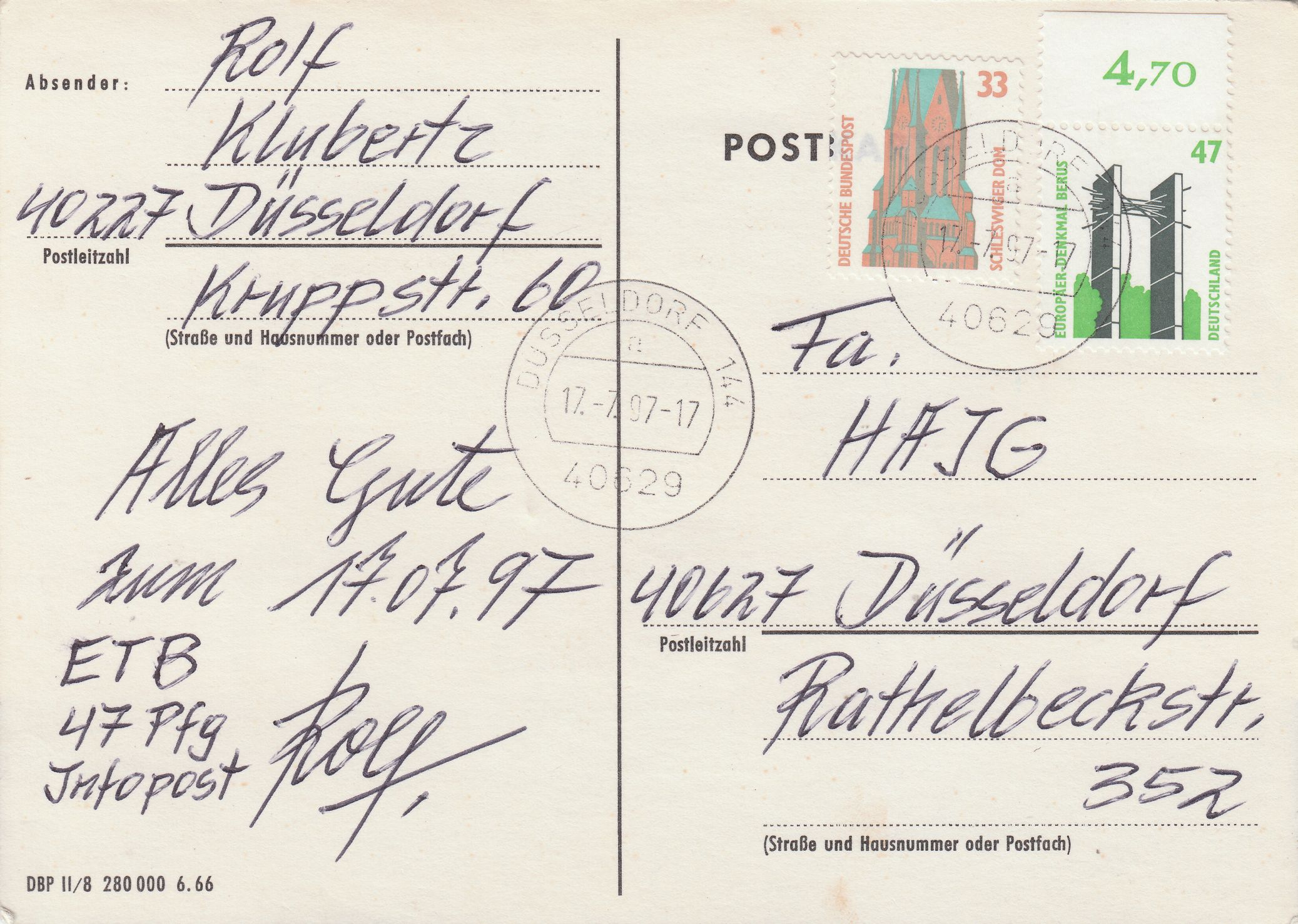 Diese MiF am 17.07.1997 aus je einem Exemplar der Wertstufen 47 Pf sowie 33 Pf war portorichtig als FDC auf Fernpostkarte (80 Pf):