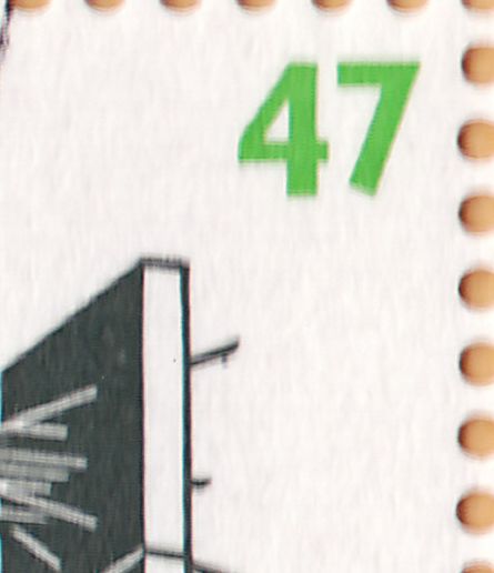 MiF eines Zehnerbogens der Wertstufe zu 47 Pf, der auf Feld 4 den Plattenfehler "Fleck unter dem Stab" zeigt: