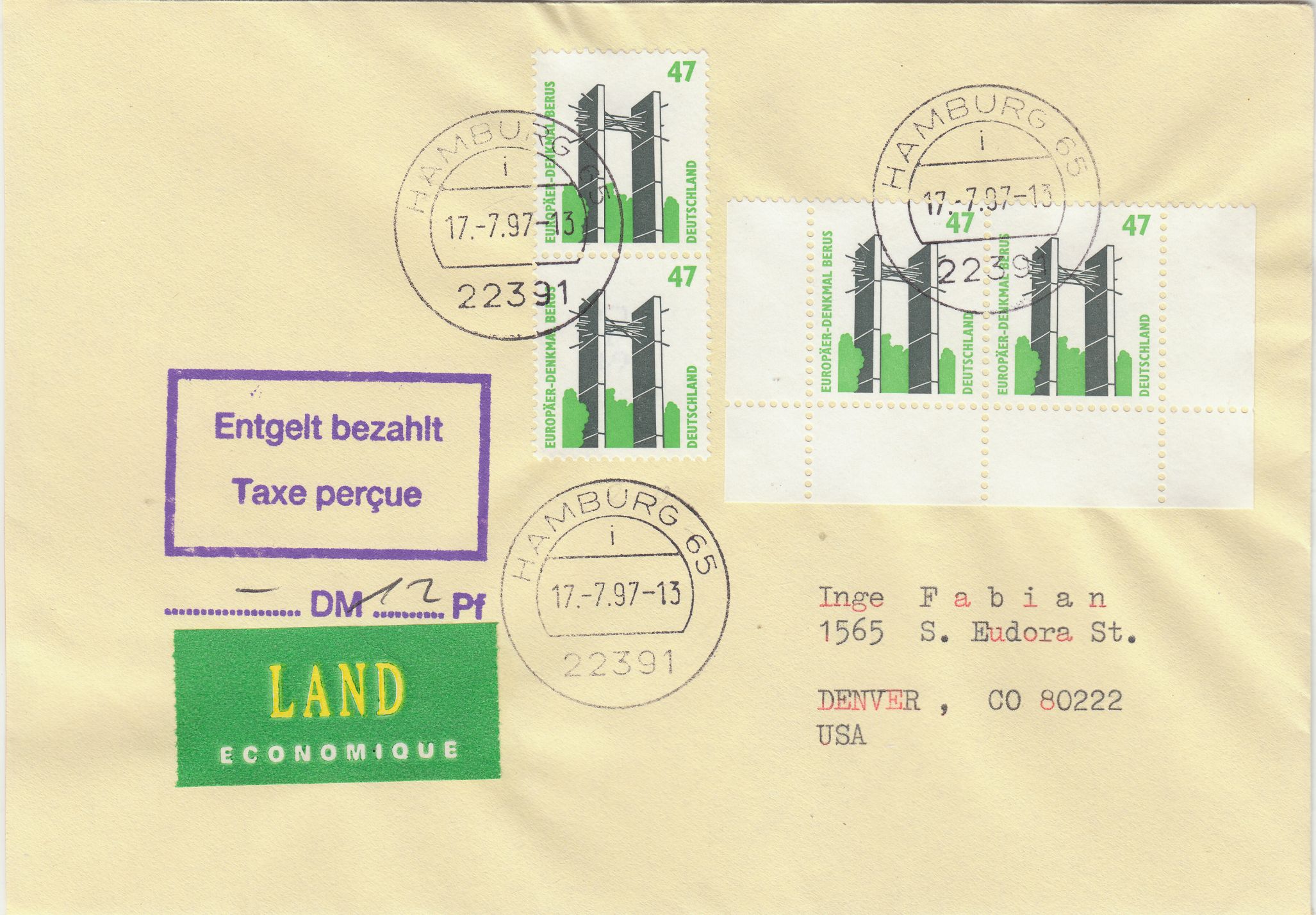 4 Exemplare der Wertstufe zu 47 Pf in Form eines waagerechten Paares vom Unterrand des Zehnerbogens sowie eines senkrechten Paares von der Rolle, untere Marke mit senkrechter Zählnummer, mit Teilbarfrankatur von 12 Pf am 17.07.1997 als Erstausgabetag portorichtig auf Weltbrief(Land), in die USA gelaufen.#