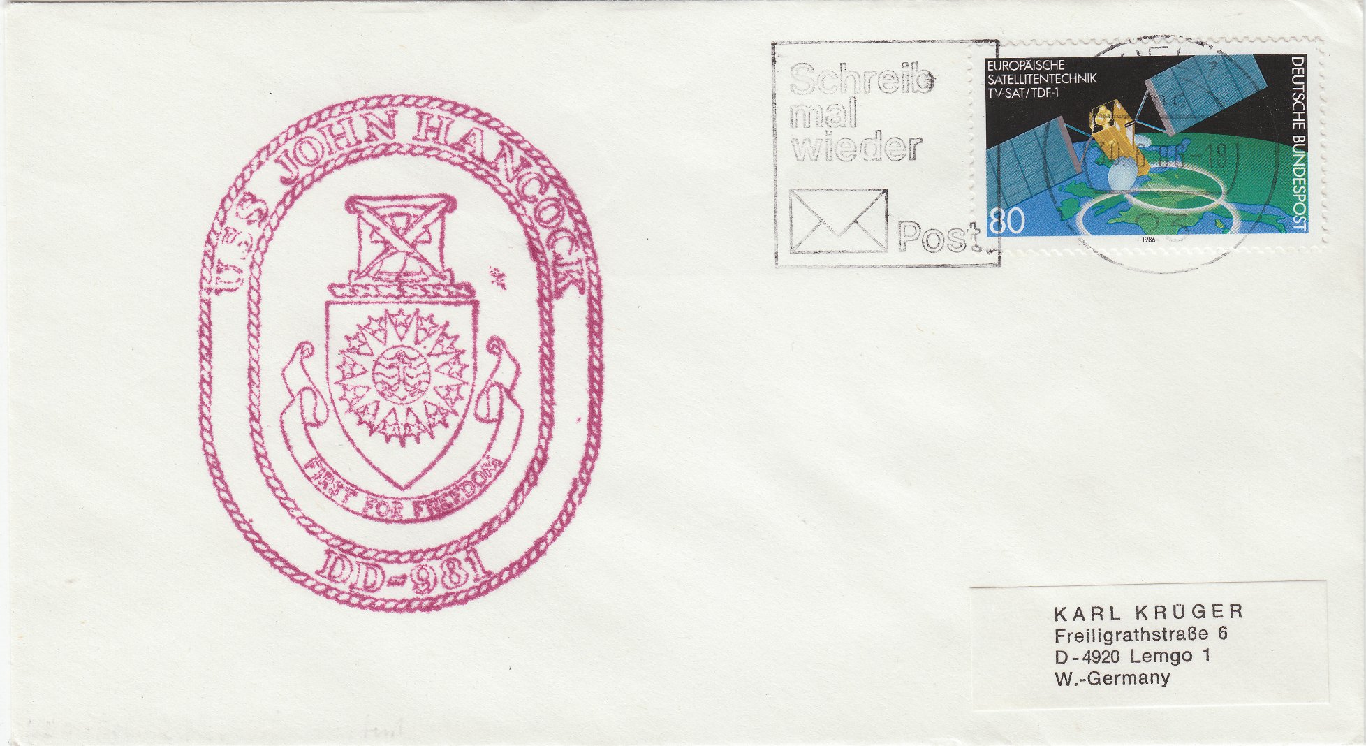 Dieser Beleg vom 30.06.1986 trägt einen Cachetstempel in Lila mit der Abbildung des Bagdes des Schiffes sowie der Entwertung der deutschen Frankatur in 23 KIEL 1:
