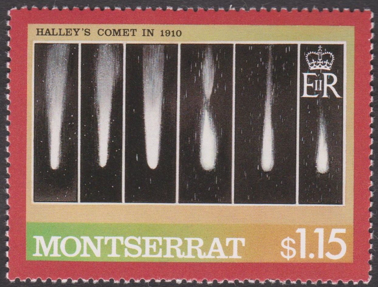 Montserrat MiNr. 626 zeigt das Motiv "Halleyscher Komet, Flugphasen":