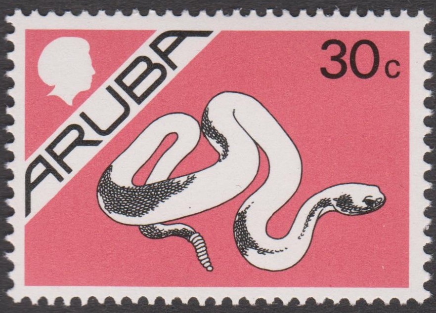 Am 01.01.1986 erschien zum Thema "Gebäude, Tiere und Leben auf Aruba" diese Freimarke in der Wertstufe 30 c, Aruba MiNr. 7:
