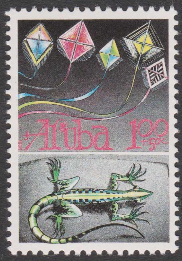 Aruba MiNr. 85 erschien am 24.10.1990 zum Thema "Jugendwohlfahrt" und zeigt als Motive Drachen und eine Eidechse: