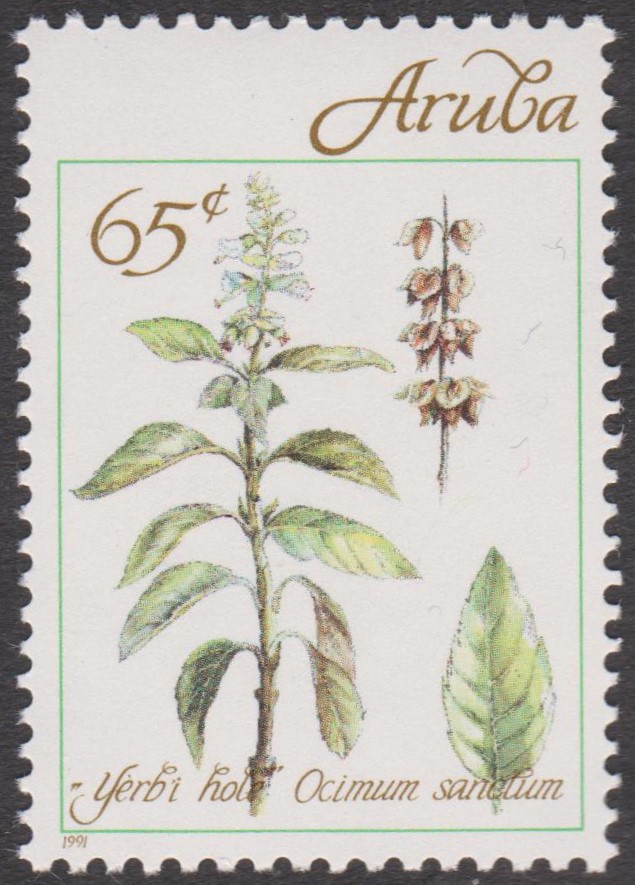 Aruba MiNr. 92 erschien am 29.05.1991 zum Thema "Heilpflanzen" und zeigt Ocimum sanctum: