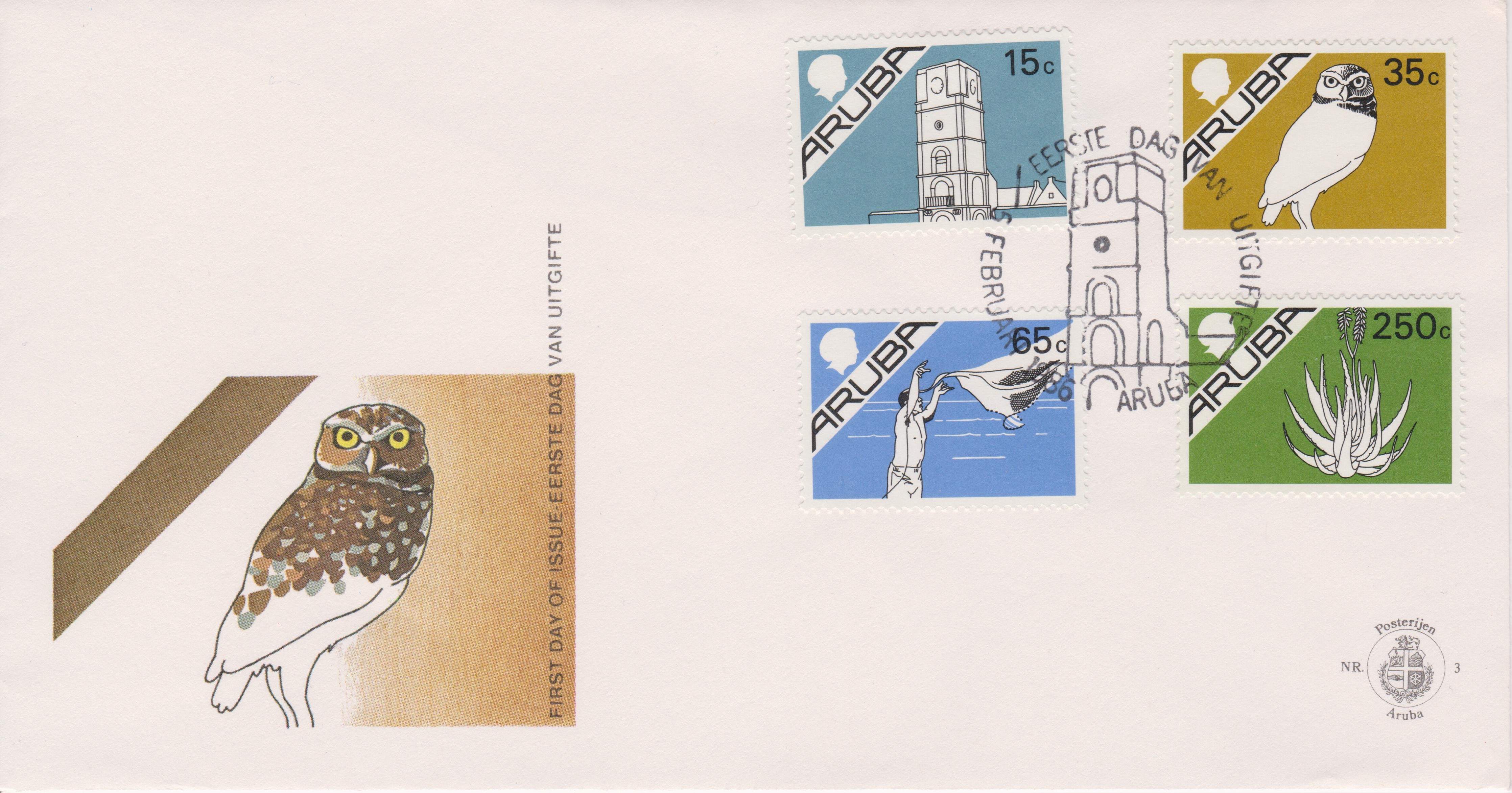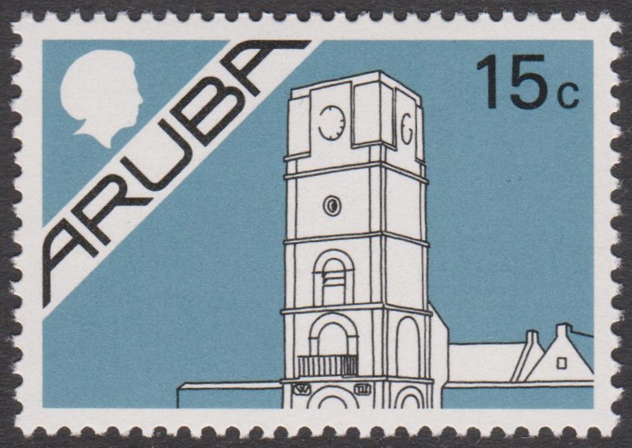 Am 05.02.1986 erschien zum Thema "Gebäude, Tiere und Leben auf Aruba" diese Freimarke in der Wertstufe 15 c, Aruba MiNr. 6: