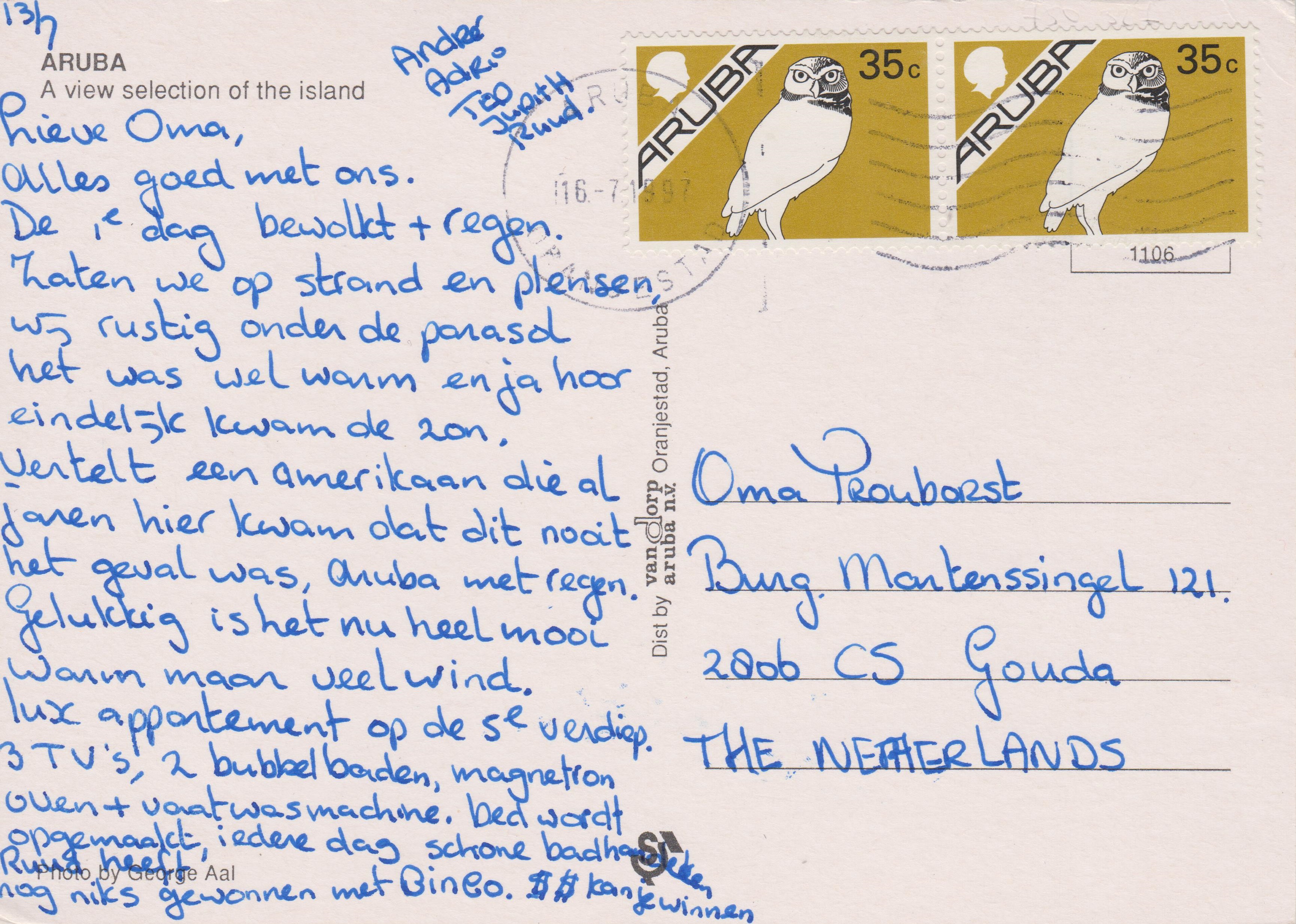 Am 05.02.1986 erschien zum Thema "Gebäude, Tiere und Leben auf Aruba" diese Freimarke in der Wertstufe 35 c, Aruba MiNr. 8, hier eine rechte obee Bogenecke: