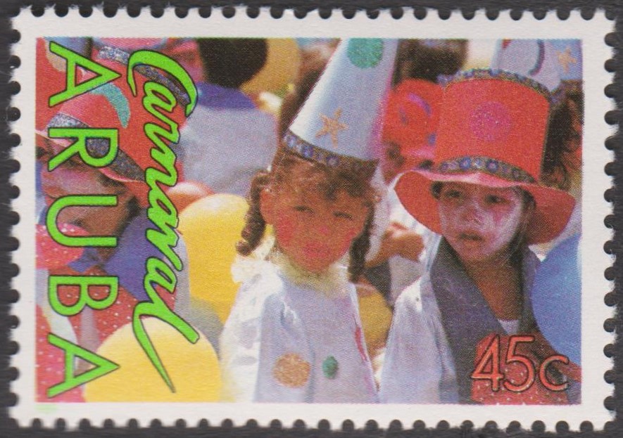 Aruba MiNr. 54 erschien am 05.01.1989 zum Thema "Karneval", Wertstufe 45 C und zeigt das Motiv "Maskierte Kinder":