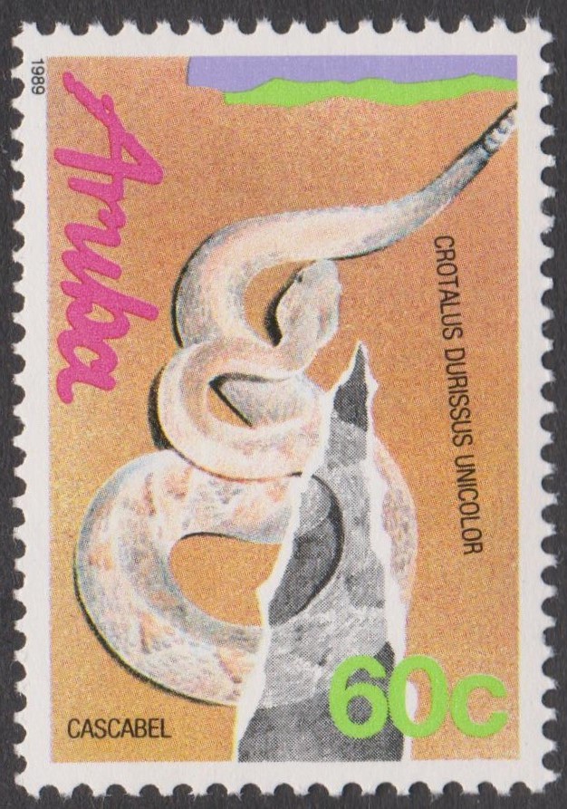 Aruba MiNr. 63 erschien am 24.08.1989 zum Thema "Klapperschlangen" und zeigt eine Tropische Klapperschlange (Crotalus durissus unicolor):