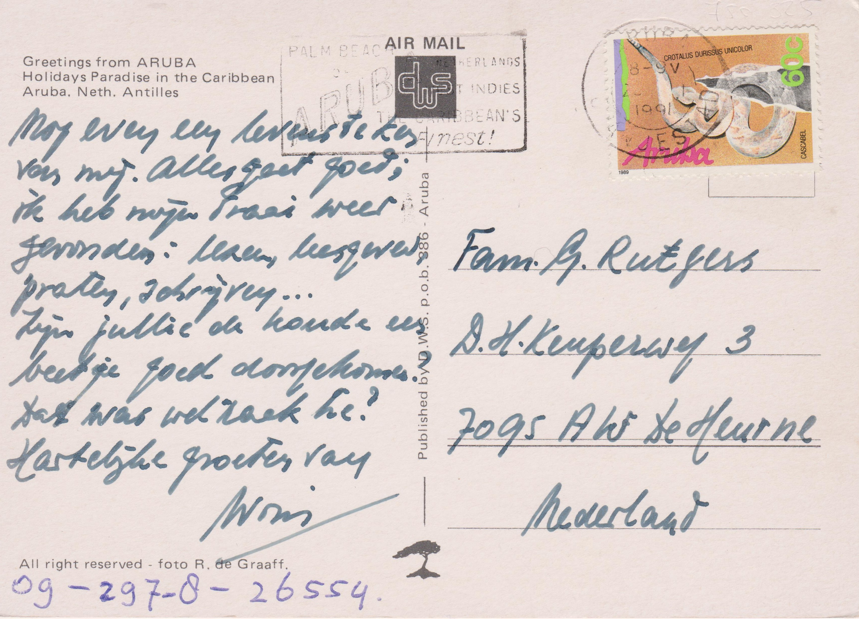 Aruba MiNr. 63 als Einzelfrankatur auf einer Postkarte in die Niederlande: