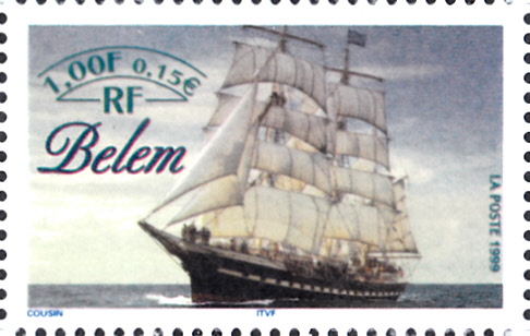 Auf einer Marke aus Frankreich (MiNr 3415) aus der Serie zur Schiffsparade "Armada du Siècle" in Rouen" ist die "Belem." abgebildet.