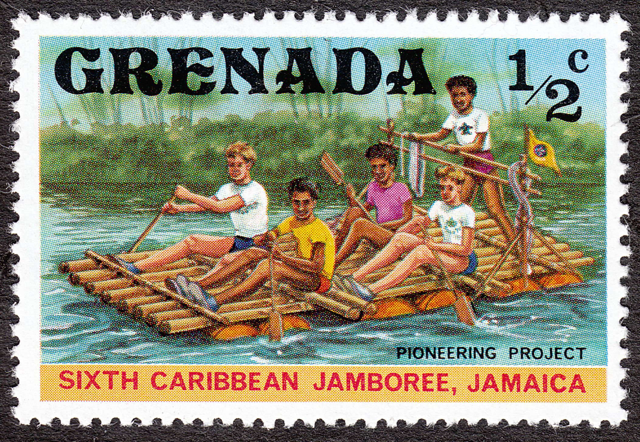 Das Postwertzeichen Grenada MiNr. 843 zeigt als Motiv eine Floßfahrt von Pfadfindern: