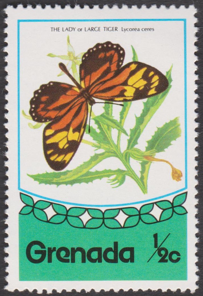 Grenada MiNr. 693 erschien am 22.09.1975 in einem Satz zum Motiv "Schmetterlinge" und zeigt "Lycorea ceres":